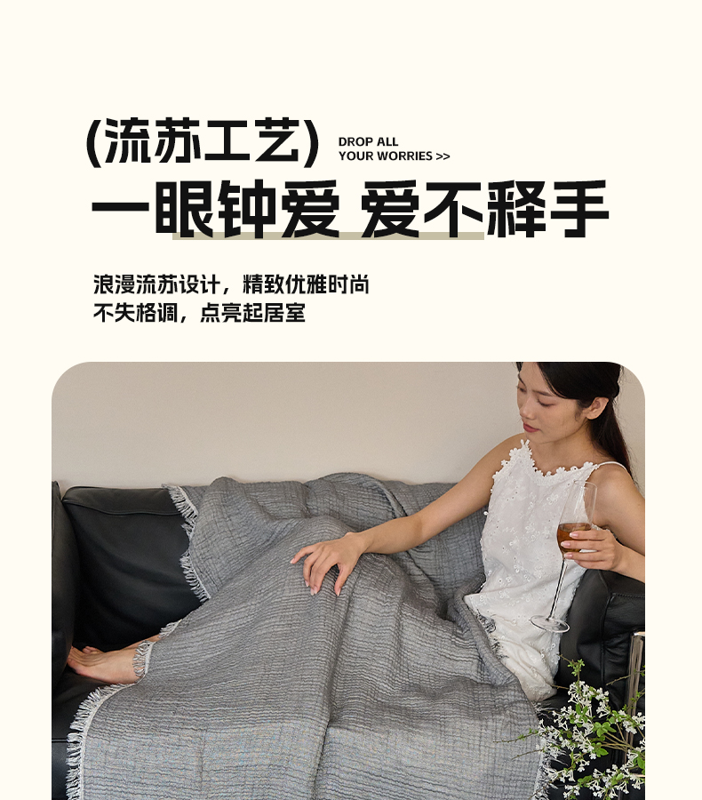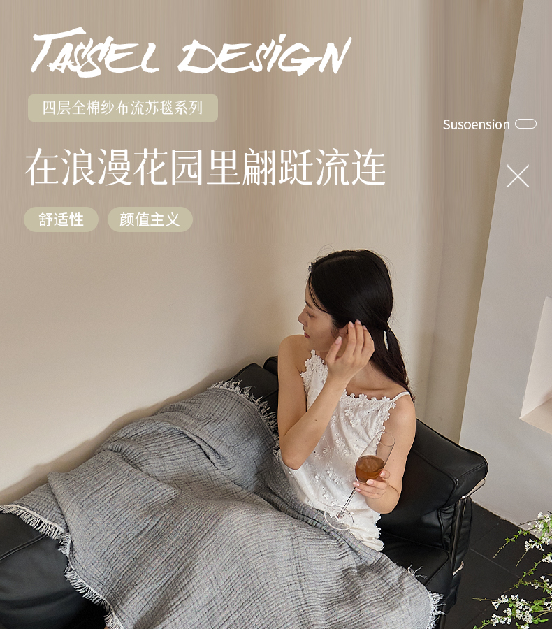沐瑟家纺 2025新款四层全棉纱布流苏毯系列-浪漫 浪漫-银灰