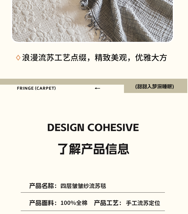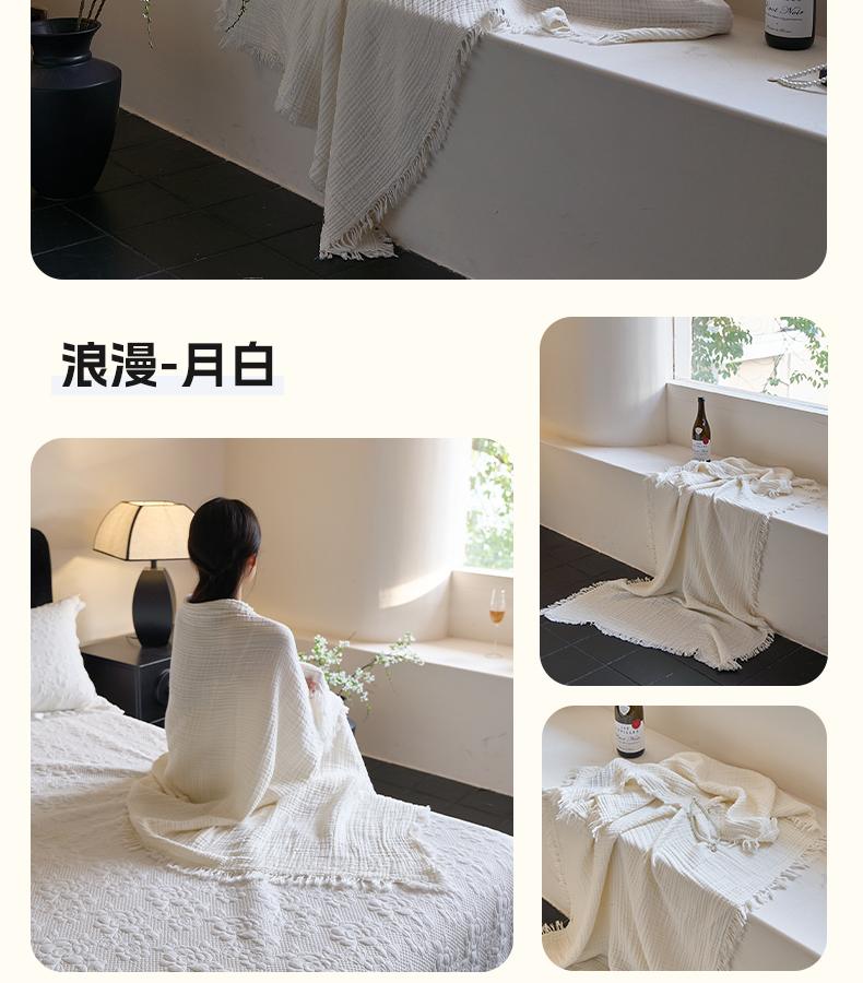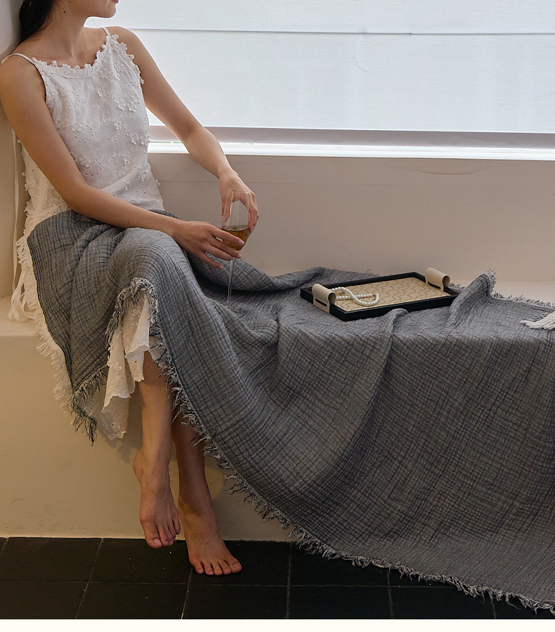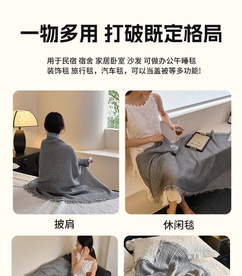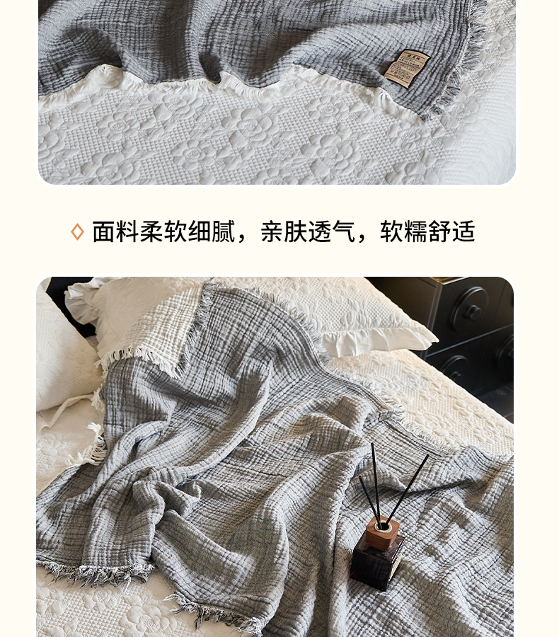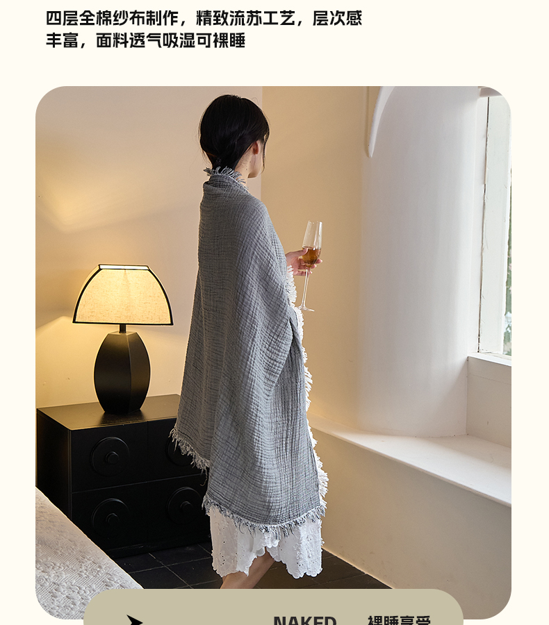 商品名称:沐瑟家纺 2025新款四层全棉纱布流苏毯系列-浪漫 浪漫-银灰