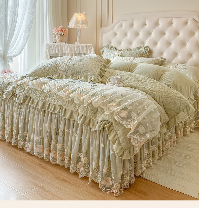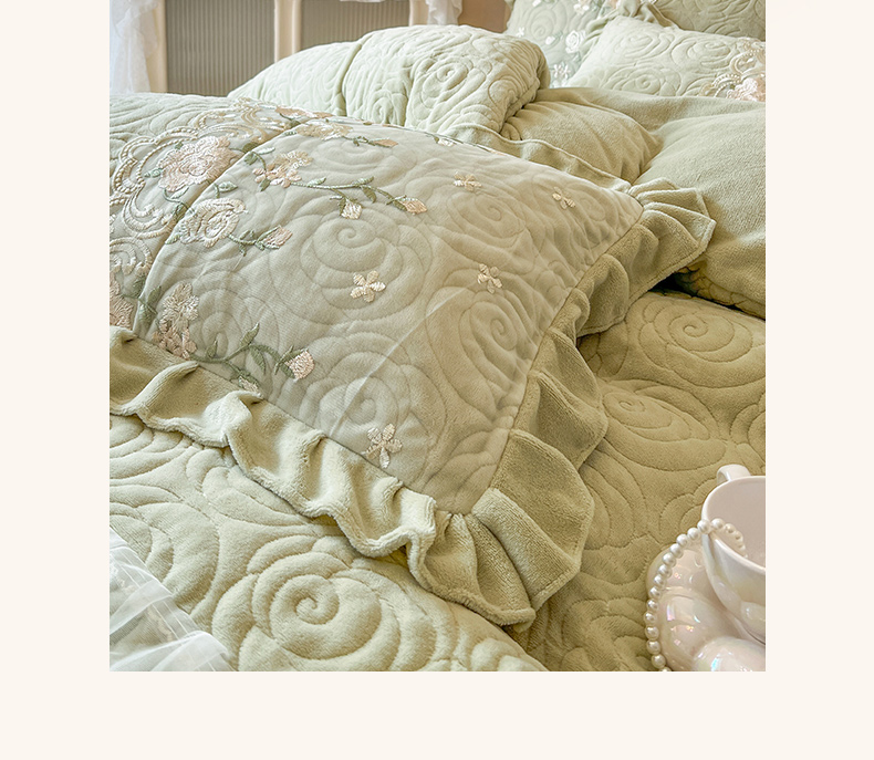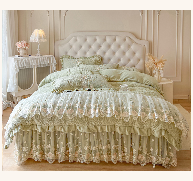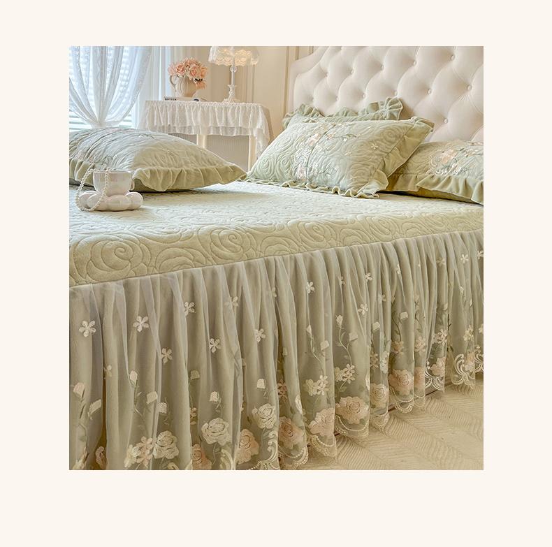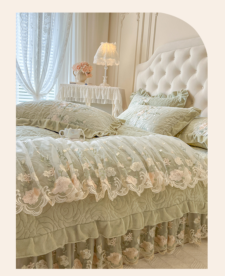 当前位置: 91家纺网 > 商品网购 > 床品套件 > 四件套 > 牛奶绒四件套 > 恋尚 2025新款柔软牛奶绒保暖蕾丝床裙四件套-玫瑰故事(控价305) 玫瑰故事-香草绿