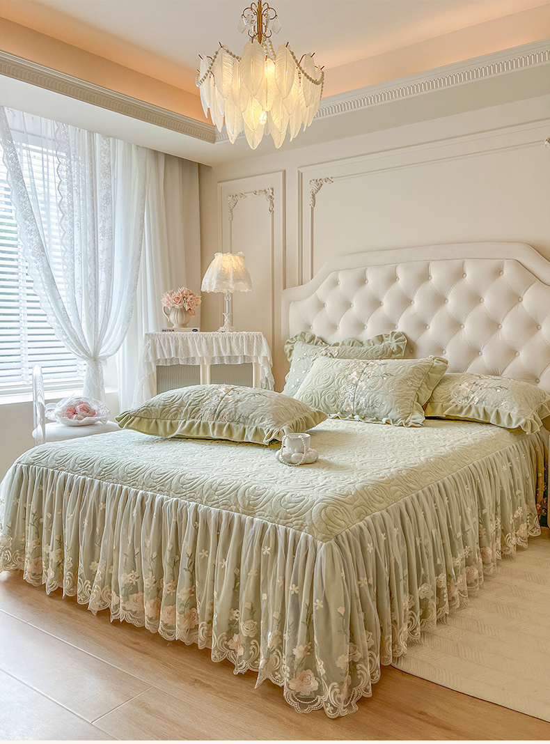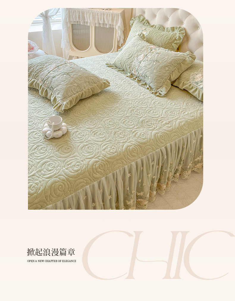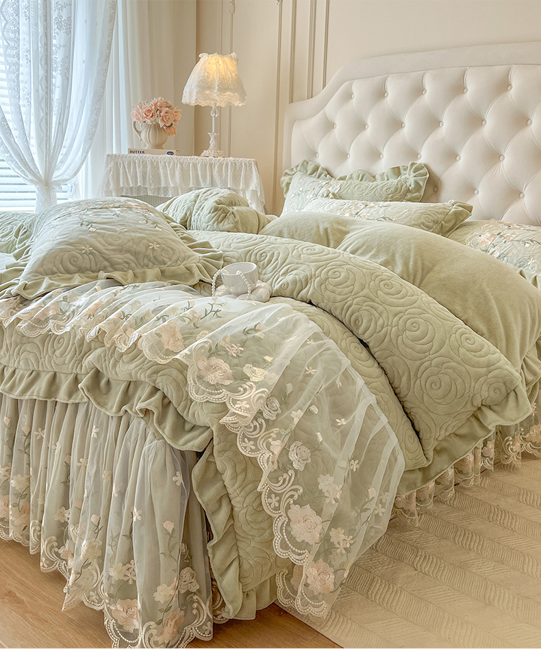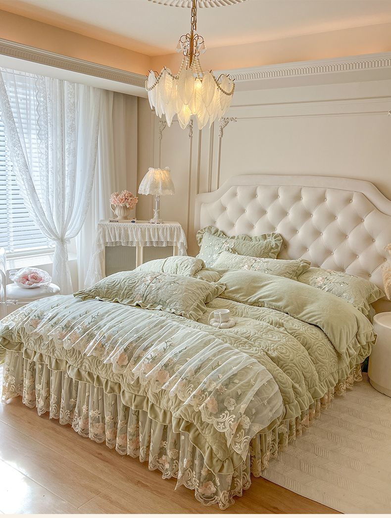 当前位置: 91家纺网 > 商品网购 > 床品套件 > 四件套 > 牛奶绒四件套 > 恋尚 2025新款柔软牛奶绒保暖蕾丝床裙四件套-玫瑰故事(控价305) 玫瑰故事-香草绿