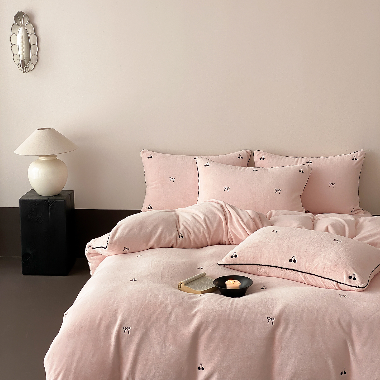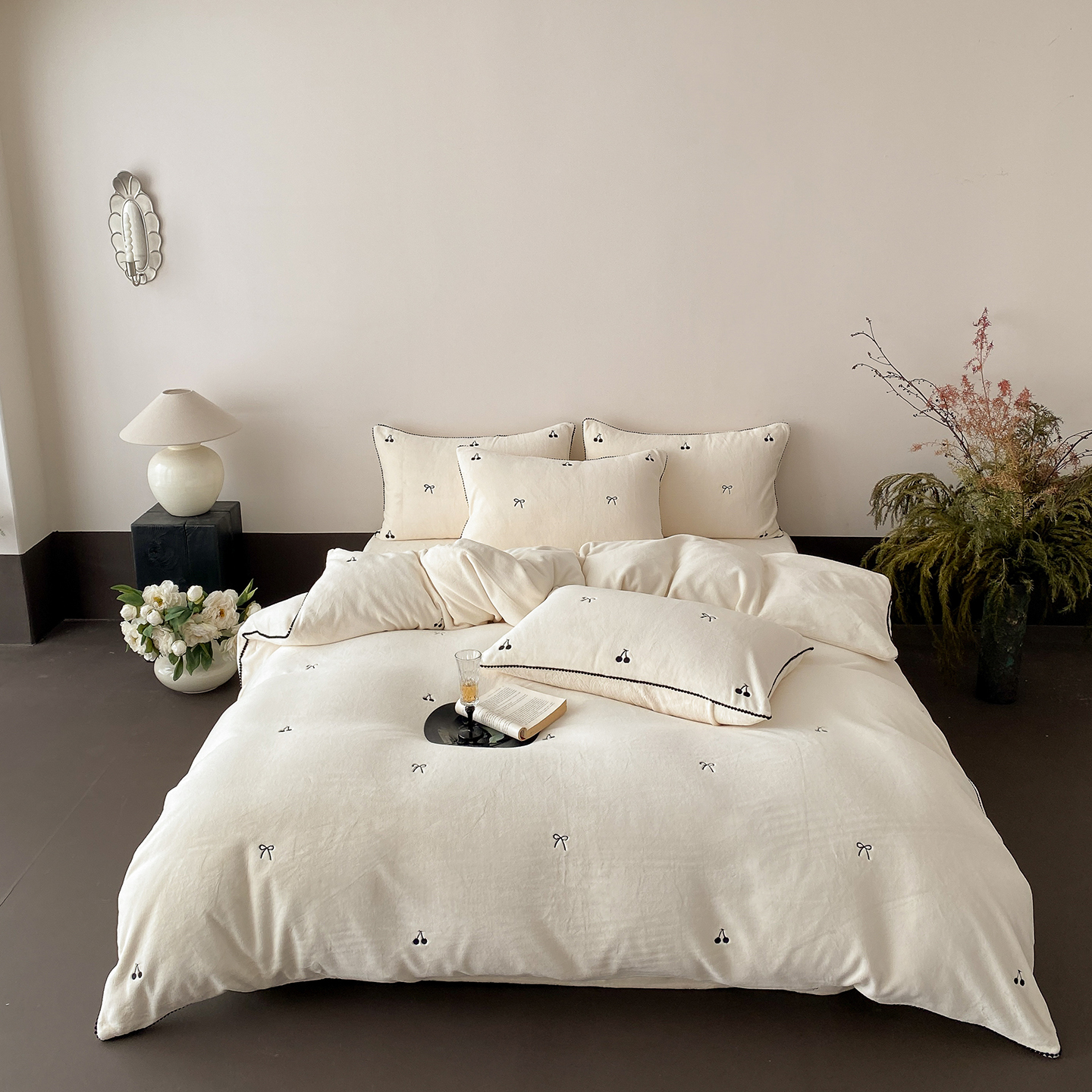 时亿家居 2025新款280g牛奶绒四件套-黑樱梦境 黑樱梦境-浅香槟