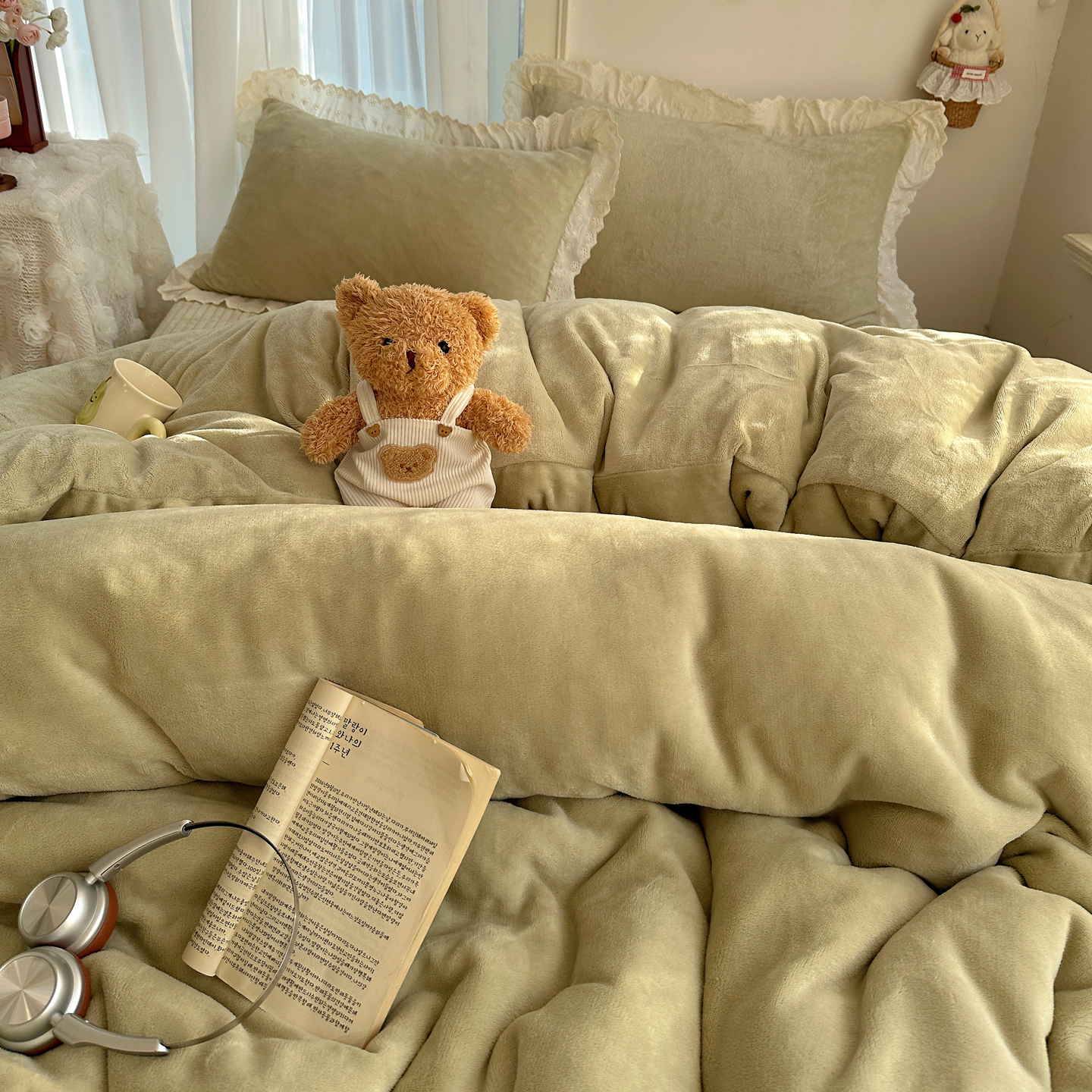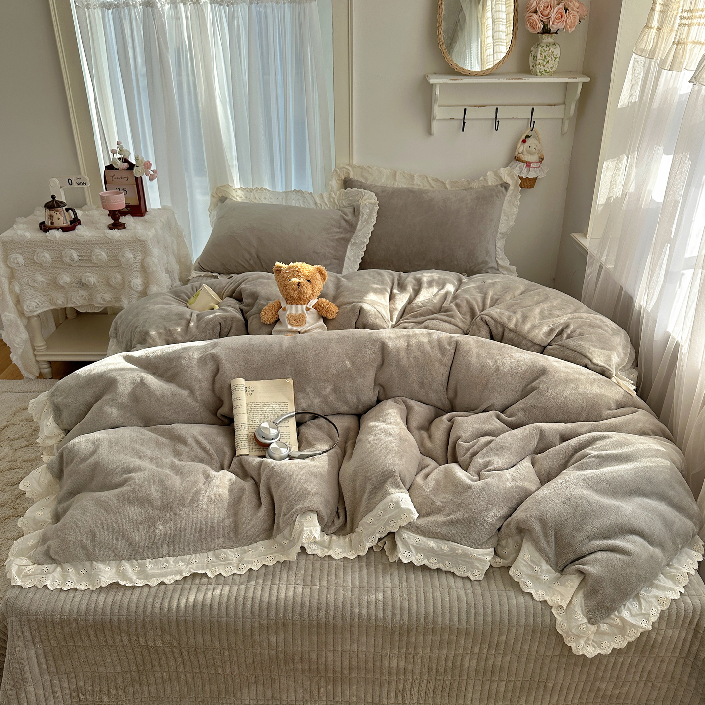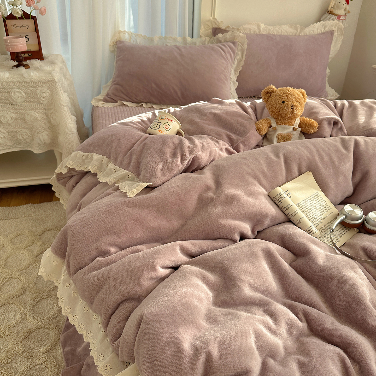 (总)欧尚 2025新款牛奶绒花边床盖四件套,粉点点,花小玉,咖色小心心,蓝点点,慕然,仙女粉,仙女紫