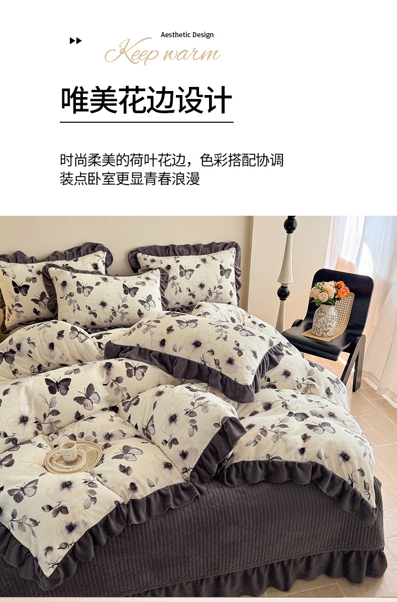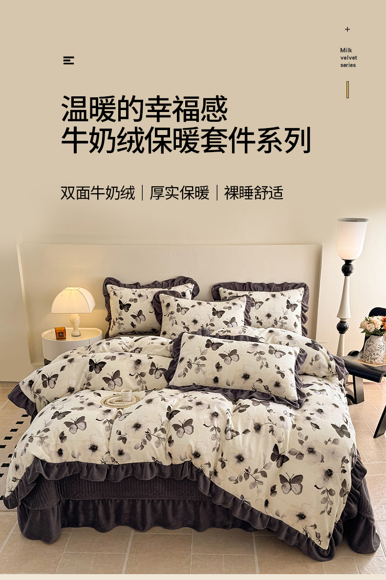 当前位置: 91家纺网 > 商品网购 > 床品套件 > 四件套 > 牛奶绒四件套 > 慕晨 2025新款花边牛奶绒床盖四件套 梨花洛