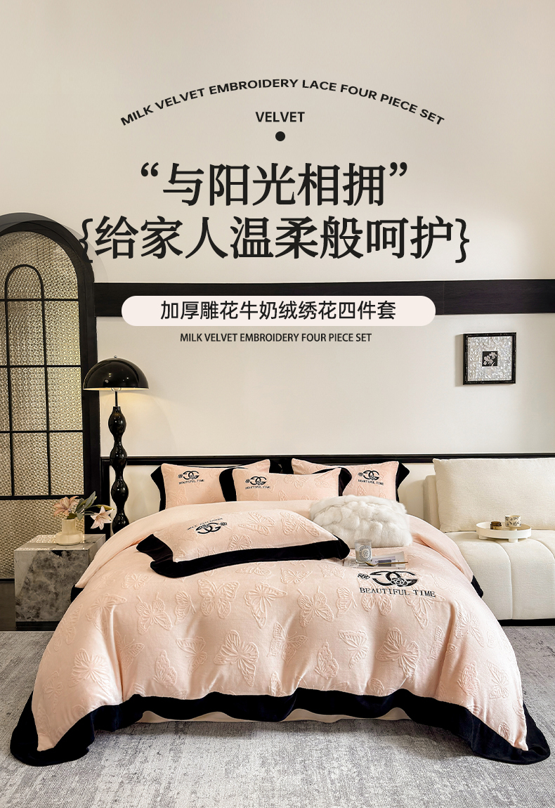 优眠坊 2025新款雕花牛奶绒绣花四件套 蝴蝶-粉
