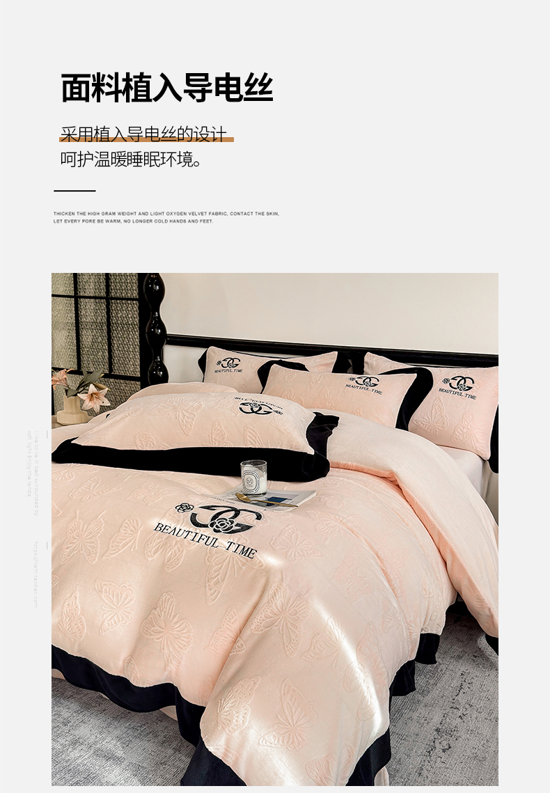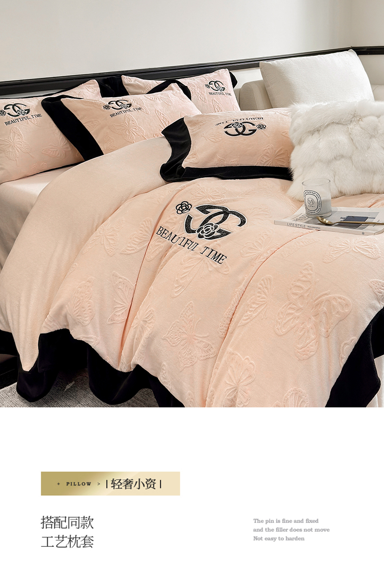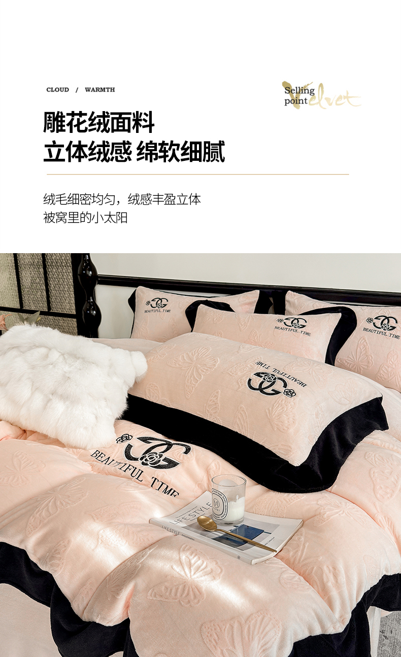 商品名称:优眠坊 2025新款雕花牛奶绒绣花四件套 蝴蝶-粉