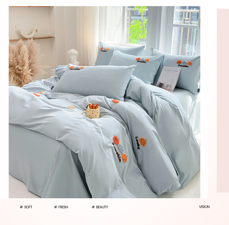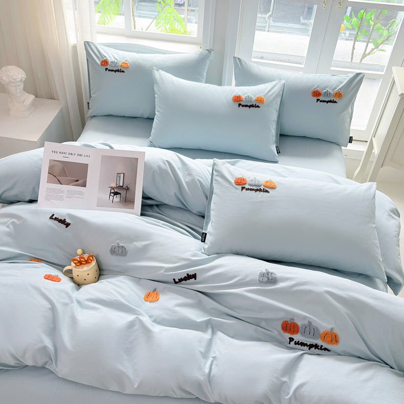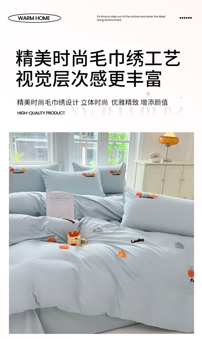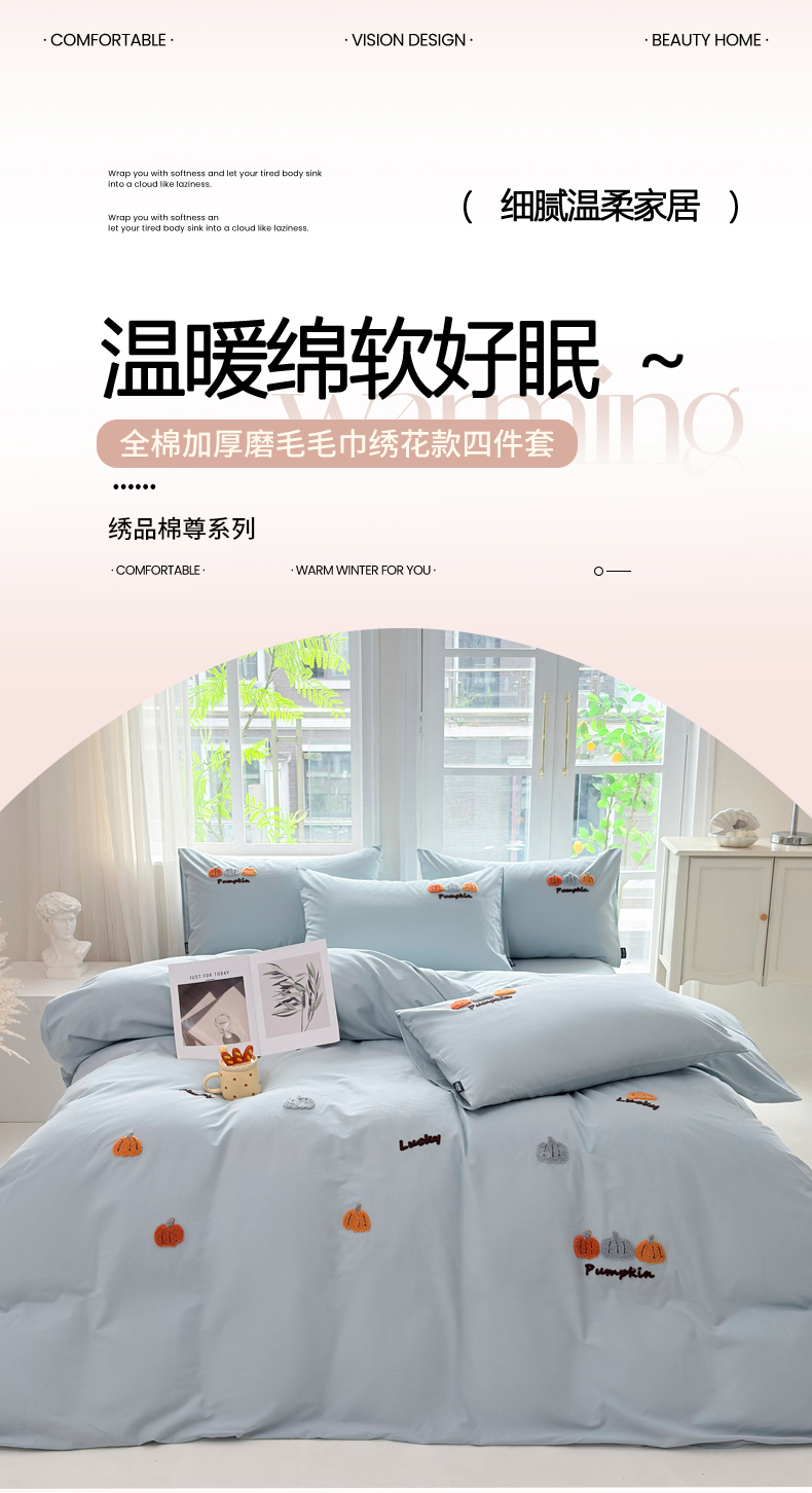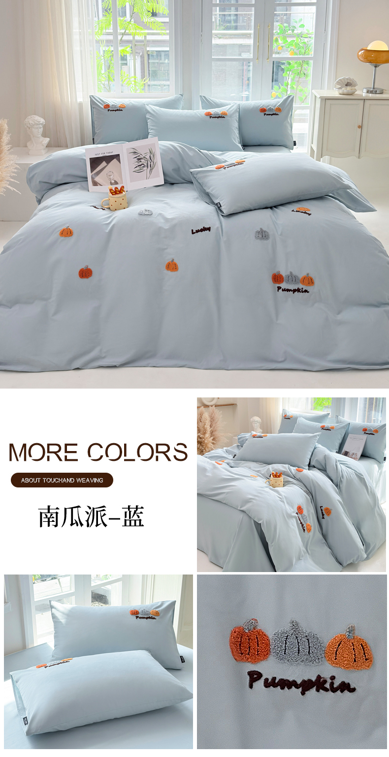 • 91家纺网 家纺一手货源 找家纺 未来家居 2025新款秋冬全棉加厚磨毛纯色毛巾绣花款工艺四件套 南瓜派-蓝