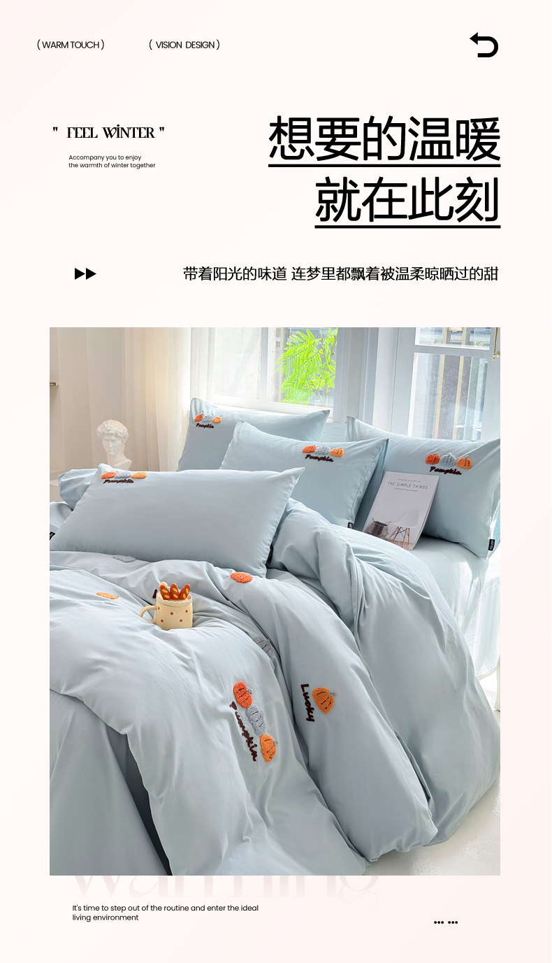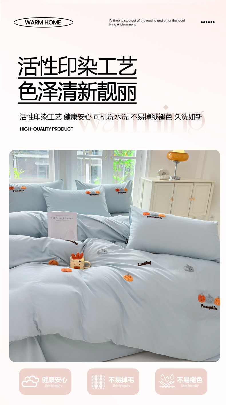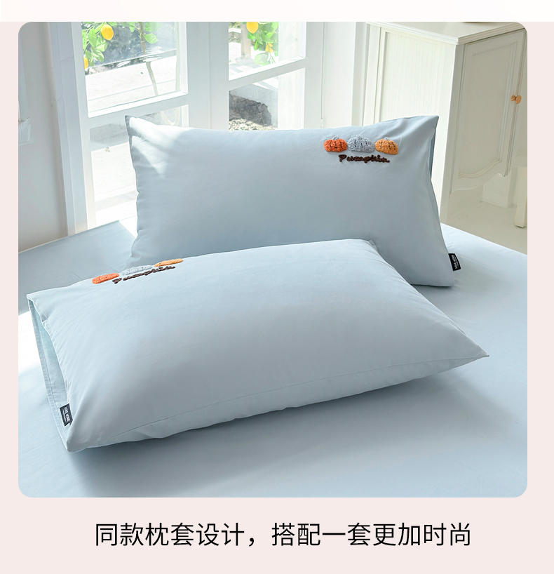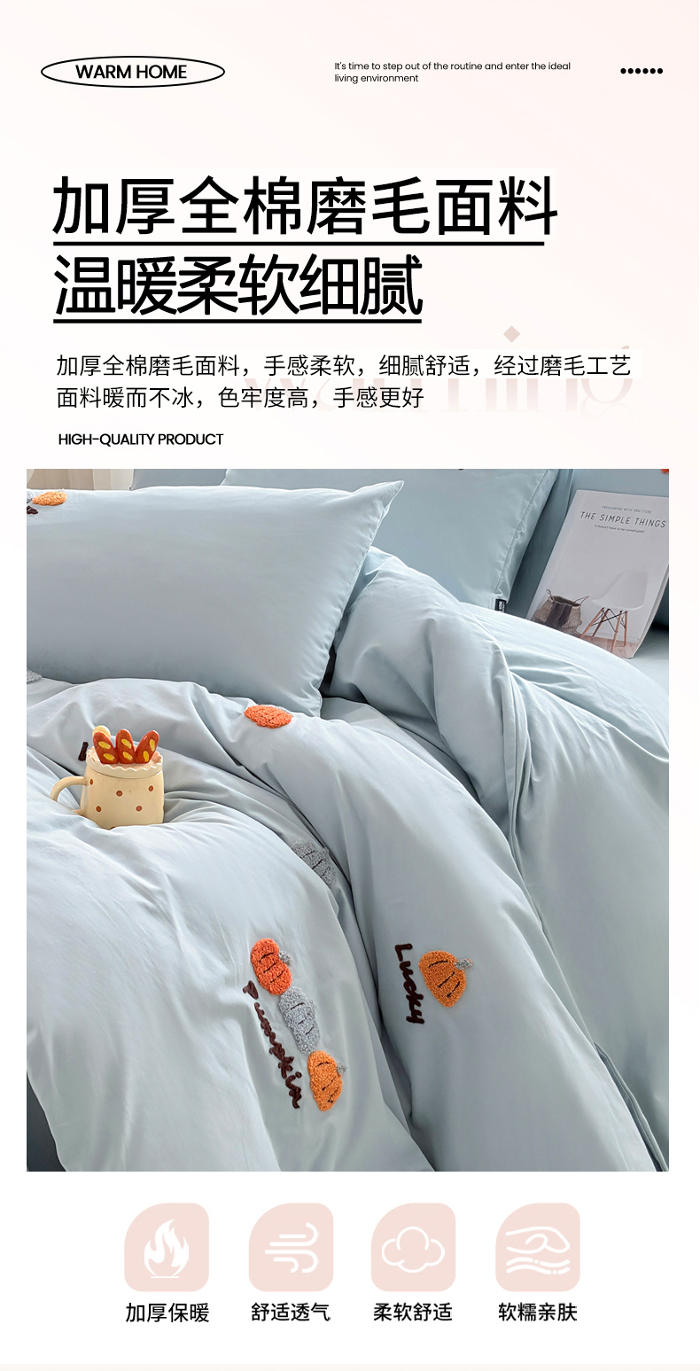 • 91家纺网 家纺一手货源 找家纺 未来家居 2025新款秋冬全棉加厚磨毛纯色毛巾绣花款工艺四件套 南瓜派-蓝