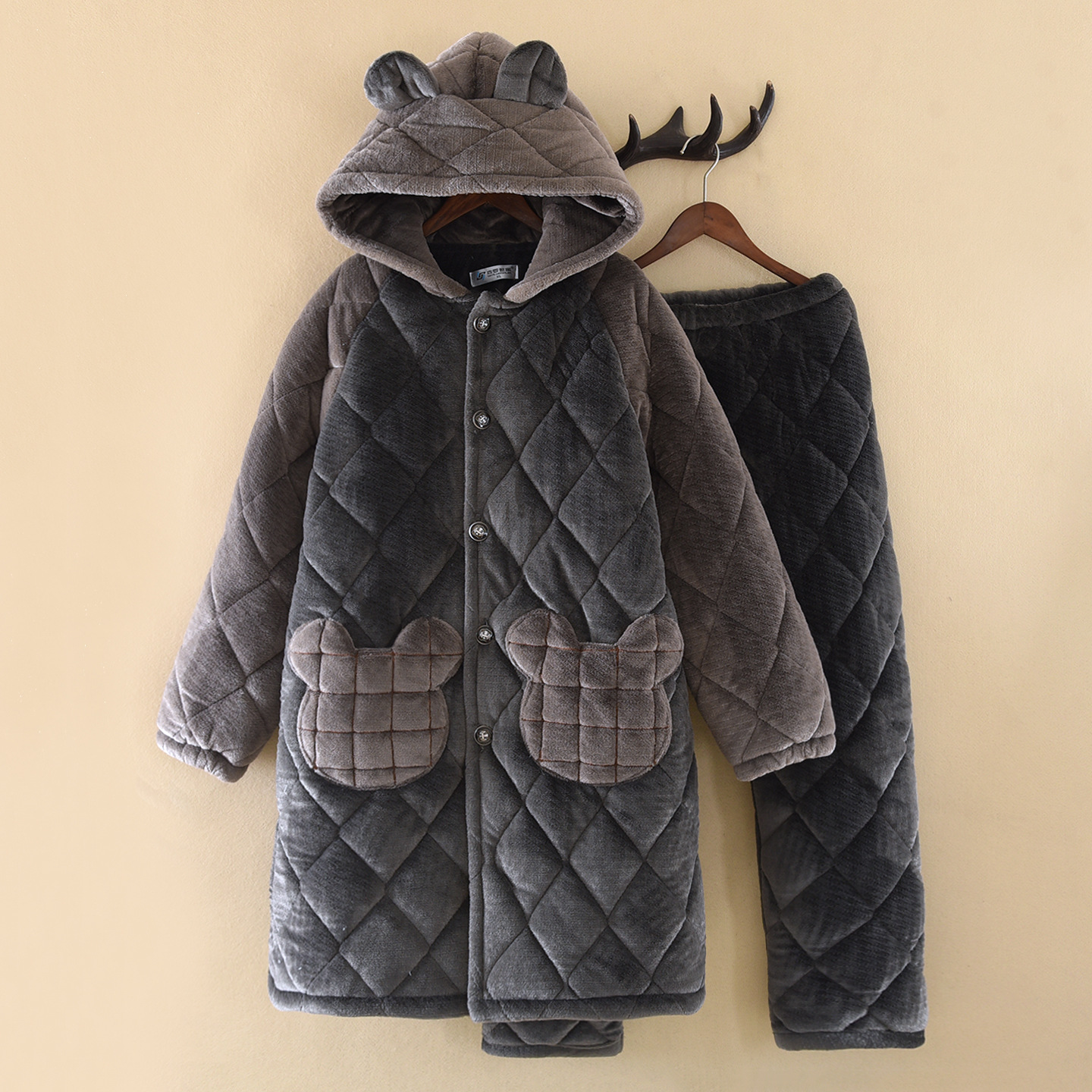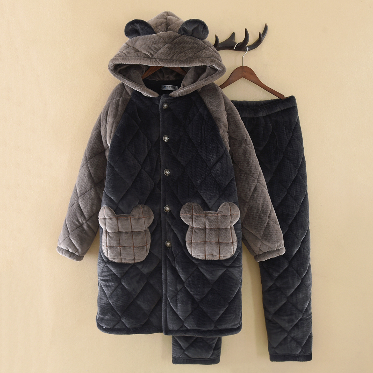 洛兰沙家居馆 2025新款只代发连帽耳朵青年睡袍男士长裤夹棉法兰绒加厚加绒冬珊瑚绒浴袍家居服 蓝色