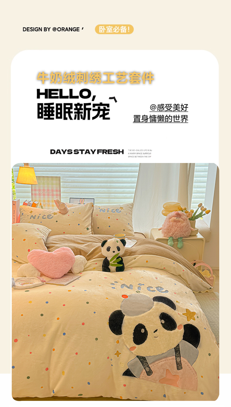 当前位置: 91家纺网 > 商品网购 > 床品套件 > 四件套 > 牛奶绒四件套 > 子钦家纺 2025新款牛奶绒卡通贴布绣床单床笠四件套-快乐熊猫(场景二) 快乐熊猫-七彩波点