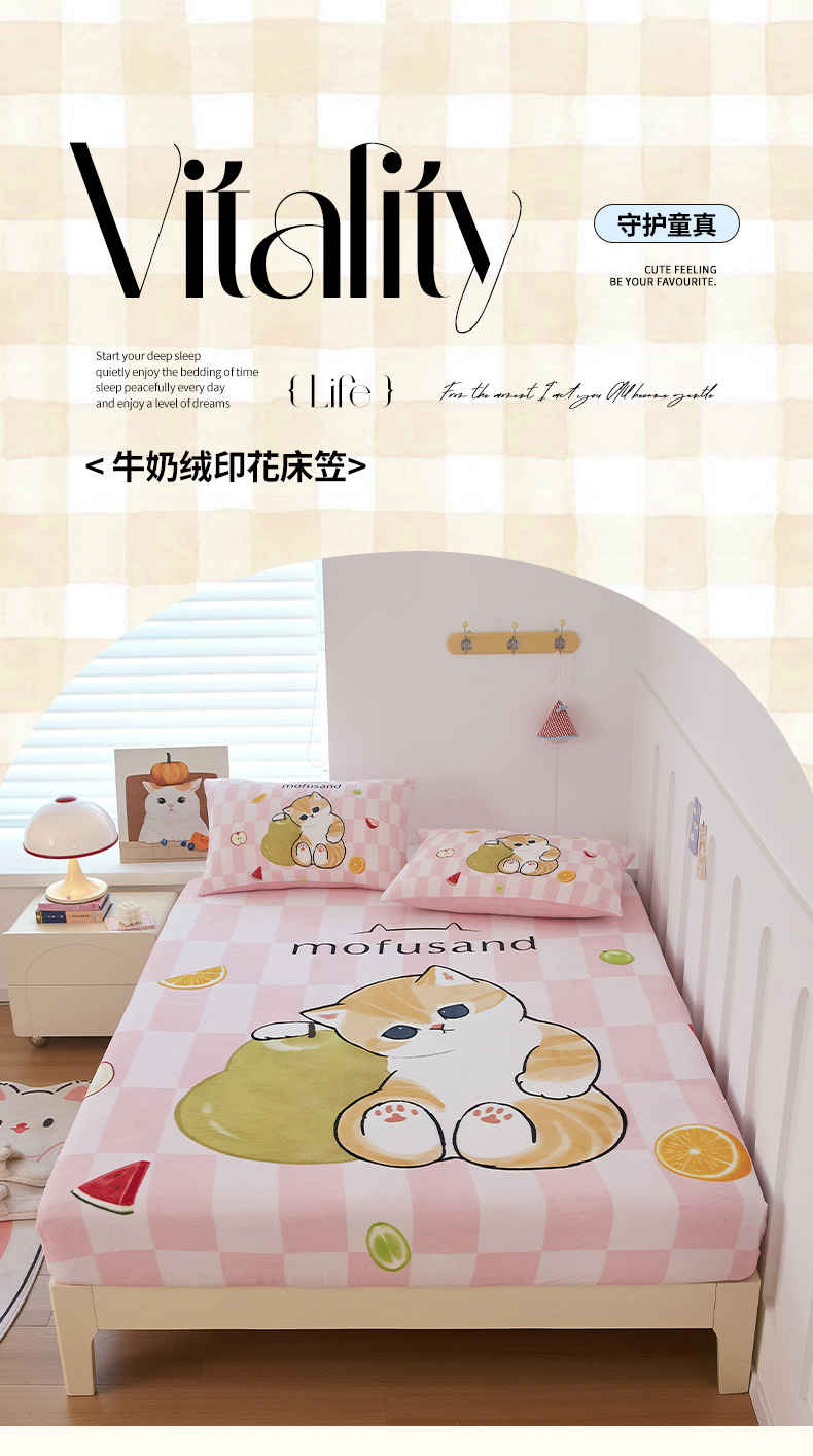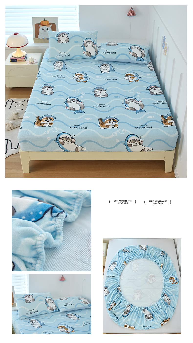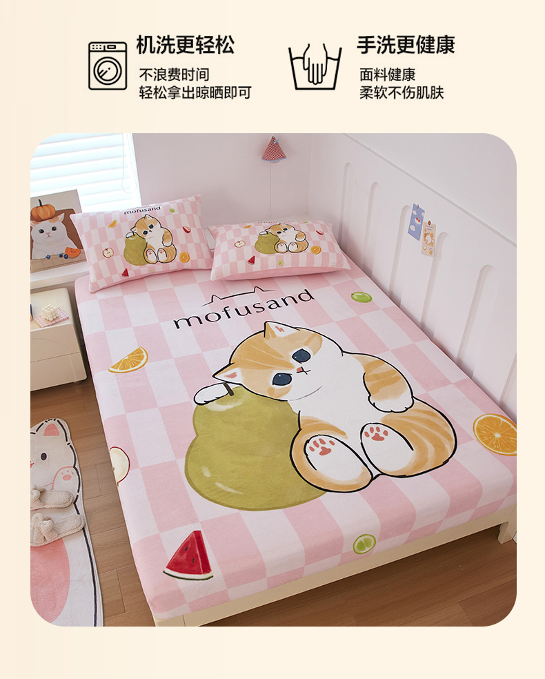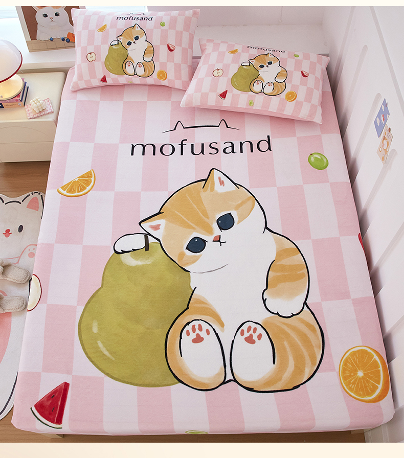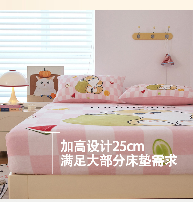 蘭菲家纺 2025新款高克重牛奶绒正版鲨鱼猫系列单品床笠 水果珊迪-猫福