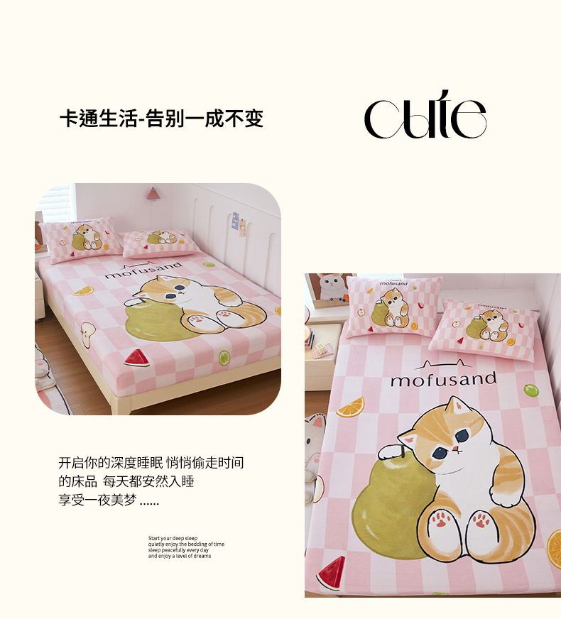 商品名称:蘭菲家纺 2025新款高克重牛奶绒正版鲨鱼猫系列单品床笠 水果珊迪-猫福