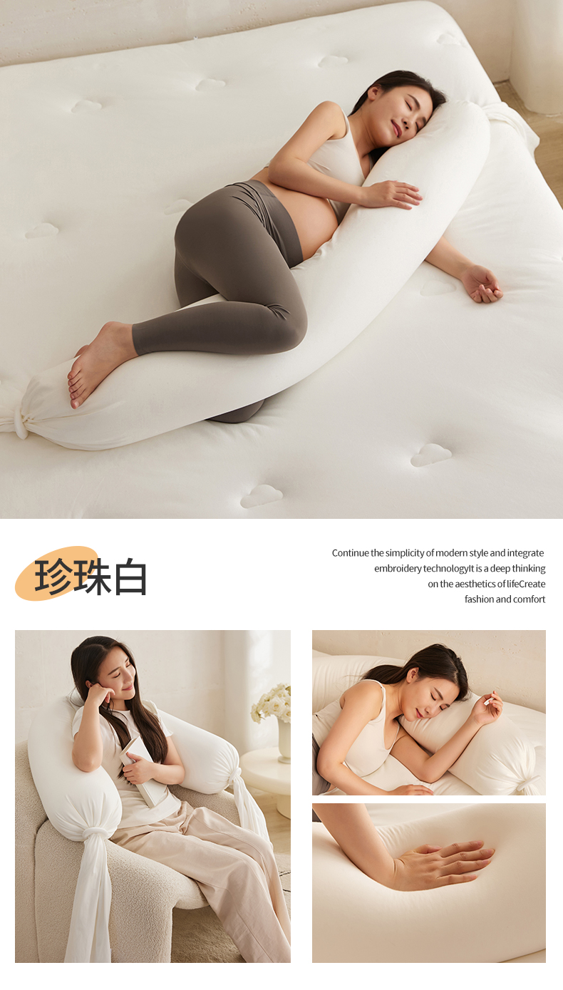 商品名称:头等舱 2025新款全棉氨纶针织A类孕妇 护腰 侧睡 靠垫 安抚枕 抱抱 夹腿多功能枕(模特图)配包装 珍珠白