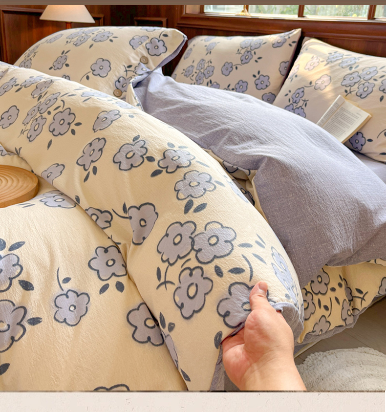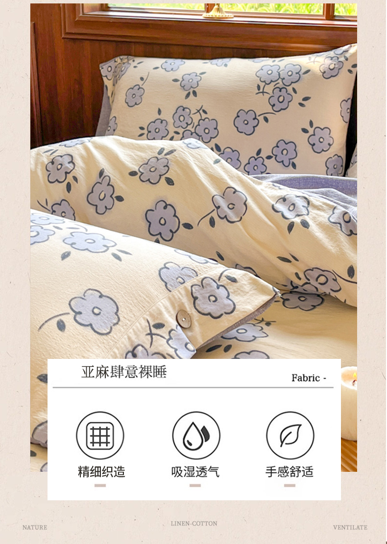 当前位置: 91家纺网 > 商品网购 > 床品套件 > 四件套 > 其它四件套 > 爱彼家纺 2025四季款亲水洗麻亚麻皱皱纱四件套-纽扣款-提供买家秀 素韵花兰