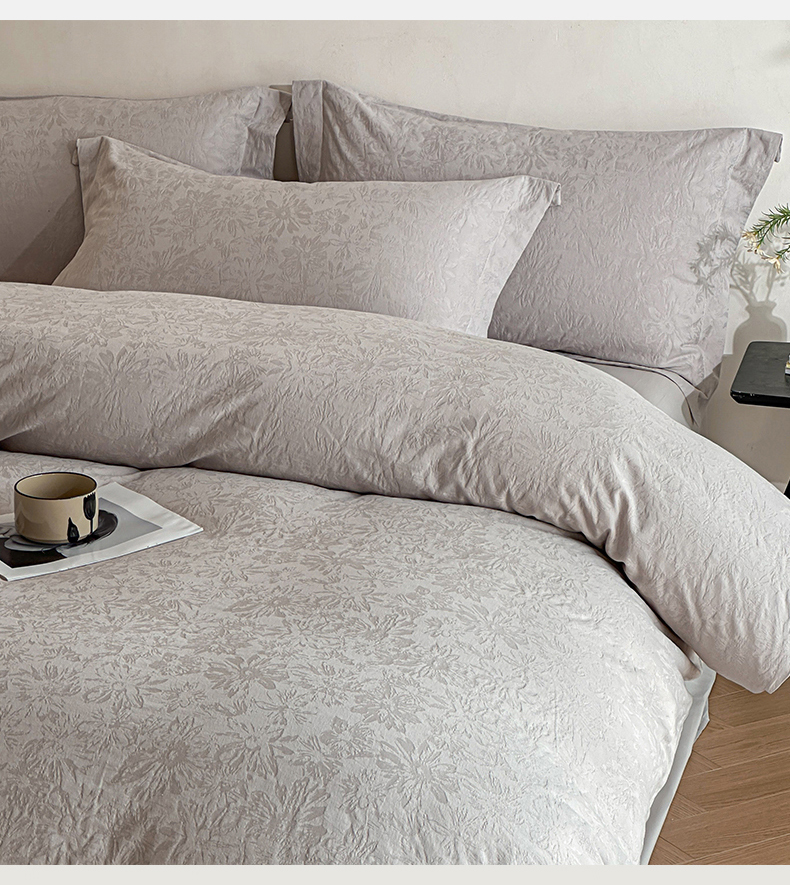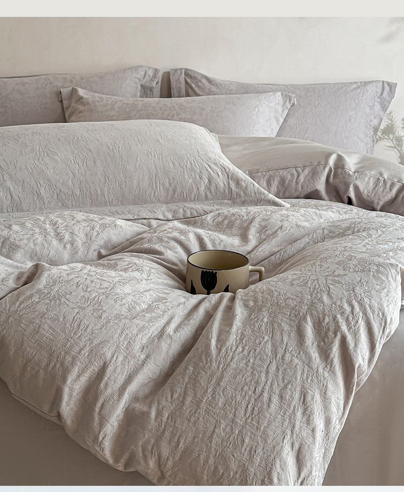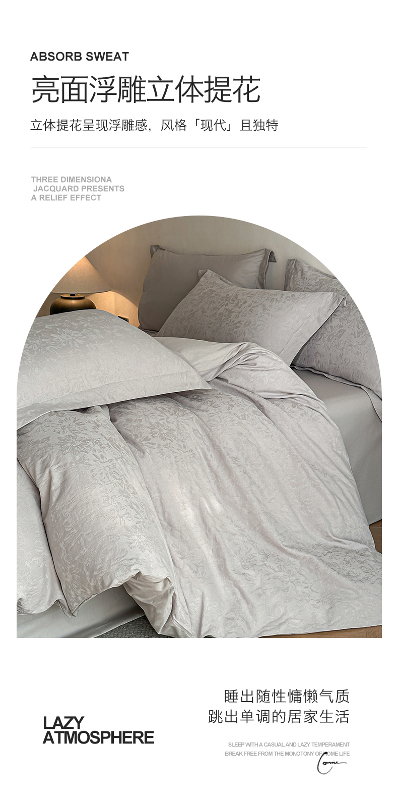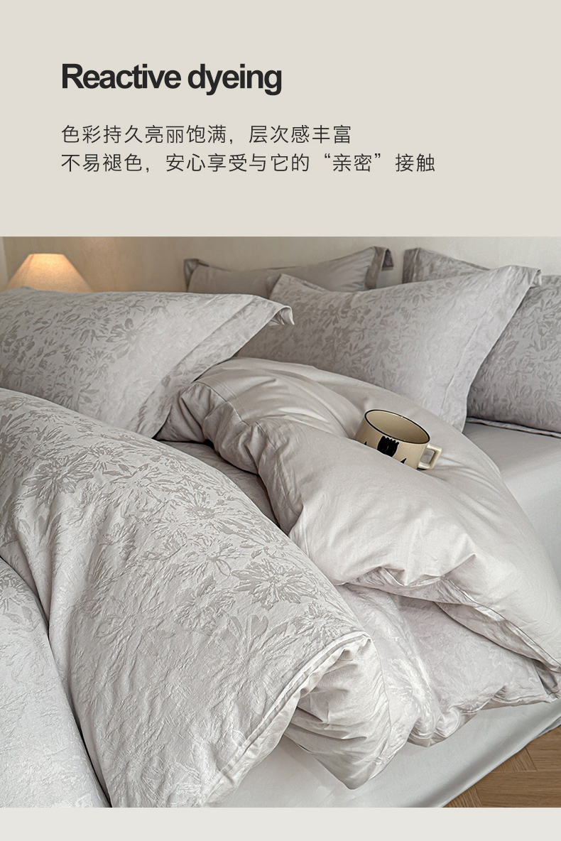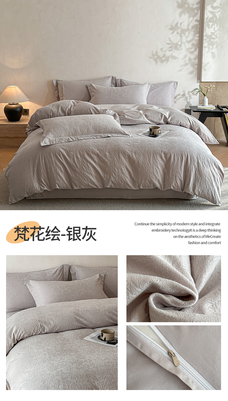 当前位置: 91家纺网 > 商品网购 > 床品套件 > 四件套 > 全棉普通四件套 > 笙意家纺 2025新款全棉纯棉60水洗亮面浮雕立体提花四件套 梵花绘-银灰