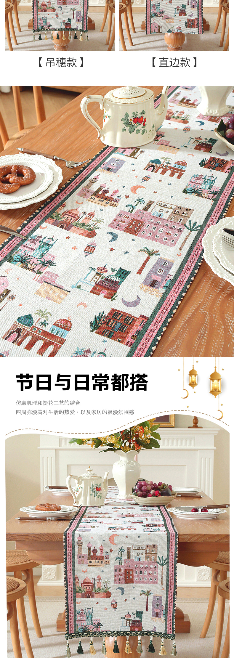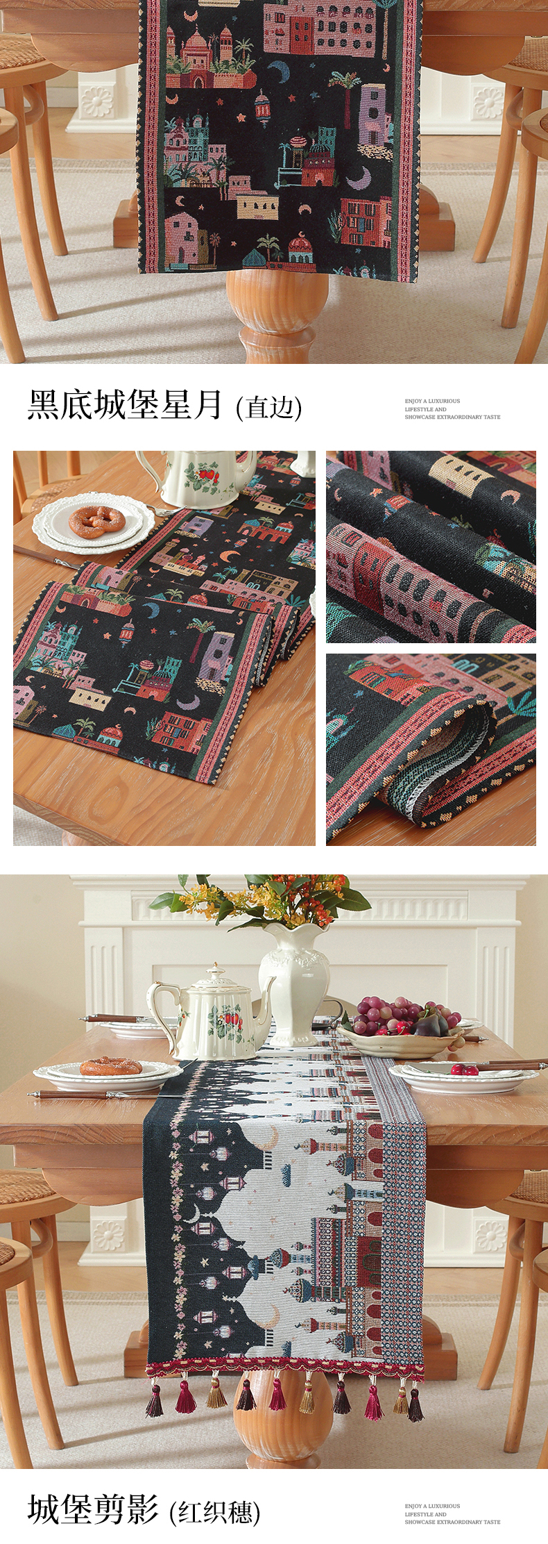 当前位置: 91家纺网 > 商品网购 > 居家布艺 > 餐桌布 > 南通大梧纺织 2026新款中东复古骆驼城堡窗花桌旗 白底城堡星月(直边)