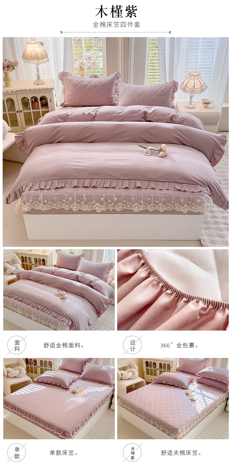 (总)美达家纺 2026新款13372全棉素色单层床笠四件套,高贵玉,灰紫,经典灰,玫瑰粉,米白,木槿紫,浅兰,浅砂灰