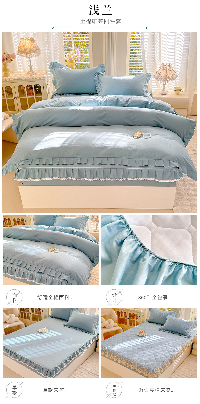(总)美达家纺 2025新款全棉纯棉AB版蕾丝小花边单层床裙四件套,解语花,南湘,沁雨花叶,悦棠,花香梦境,夏沫浅语-蓝,恋爱小兔,氧气格调,婉宁-粉,镜花水月
