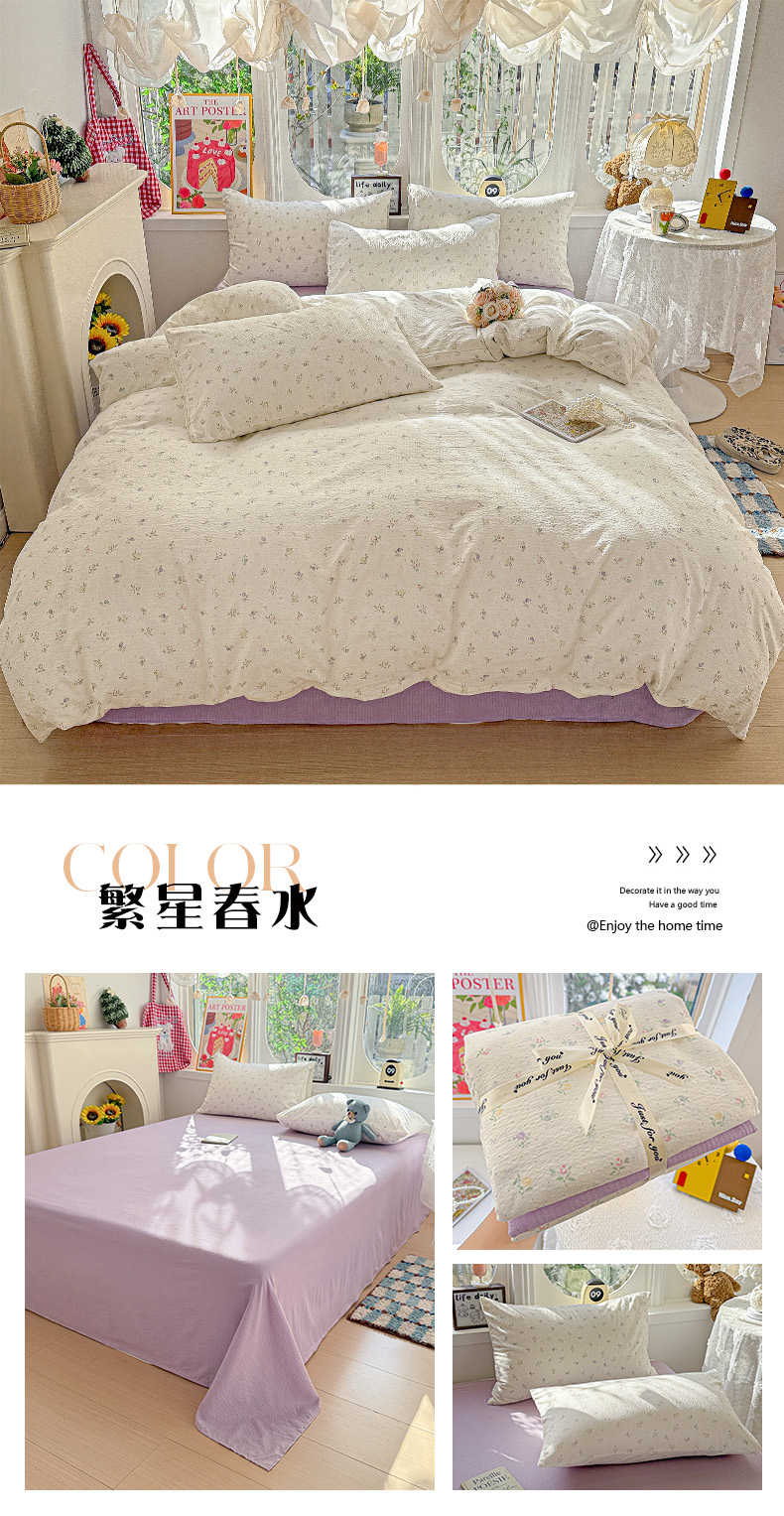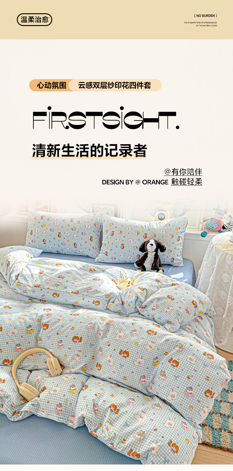 (总)朵朵家纺 2026新款云感木棉皱皱纱双层纱印花四件套,星星人,安琪拉,豹纹KT,北半球,波点草莓,春野集,蛋糕喵,繁星春水,好朋友,来财梦,兰溪,萌宠派对,芊芊花语,森林乐园,森林密语,甜茶,小新e族,小樱桃,组合图