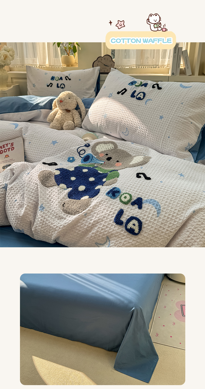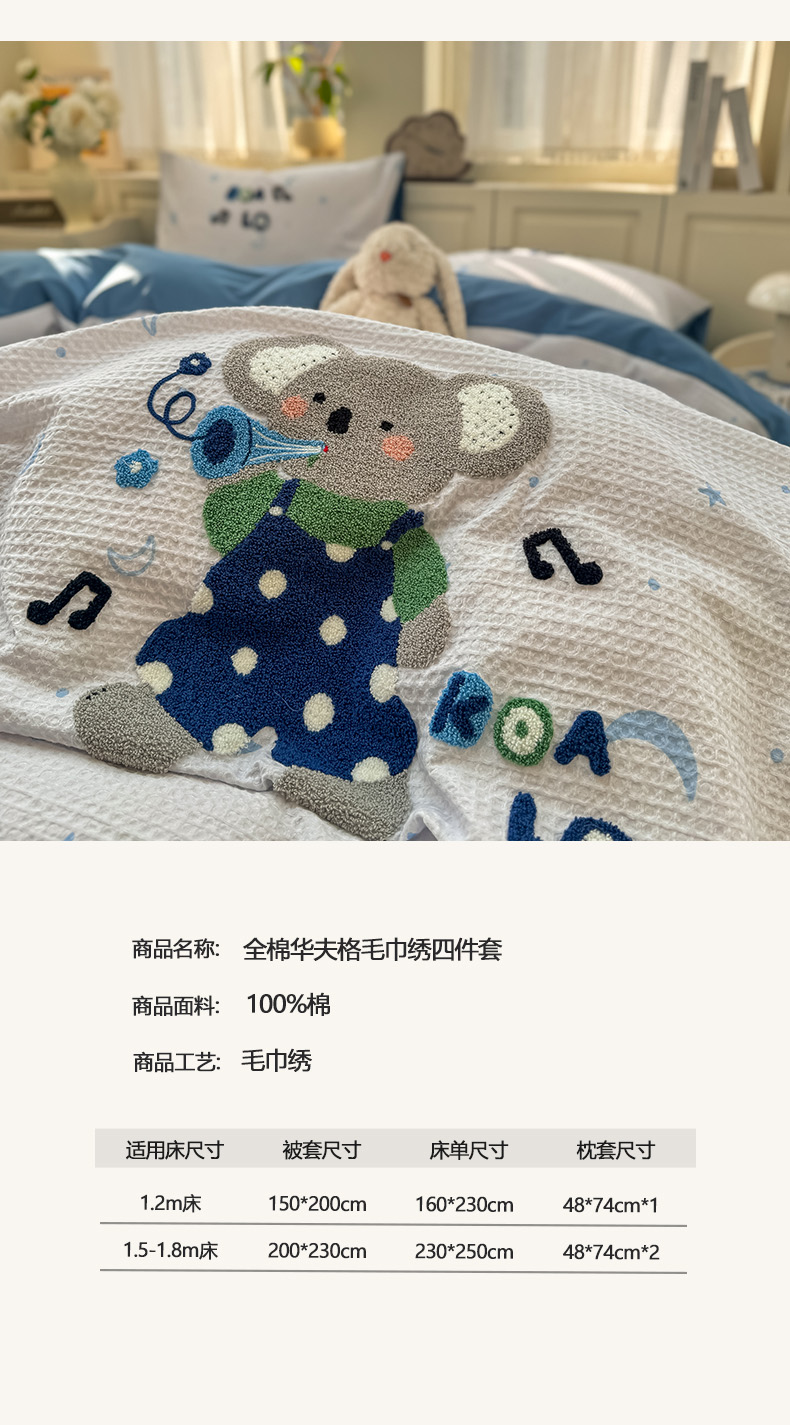 (总)帅露家纺 2026新款全棉纯棉华夫格毛巾绣四件套,爱心肥仔,波点熊,彩色日记,嘟嘟熊,绿色原野,文艺牛仔,雪崩崩,音乐派
