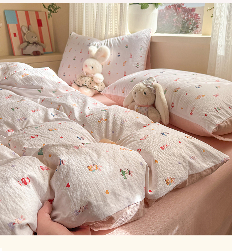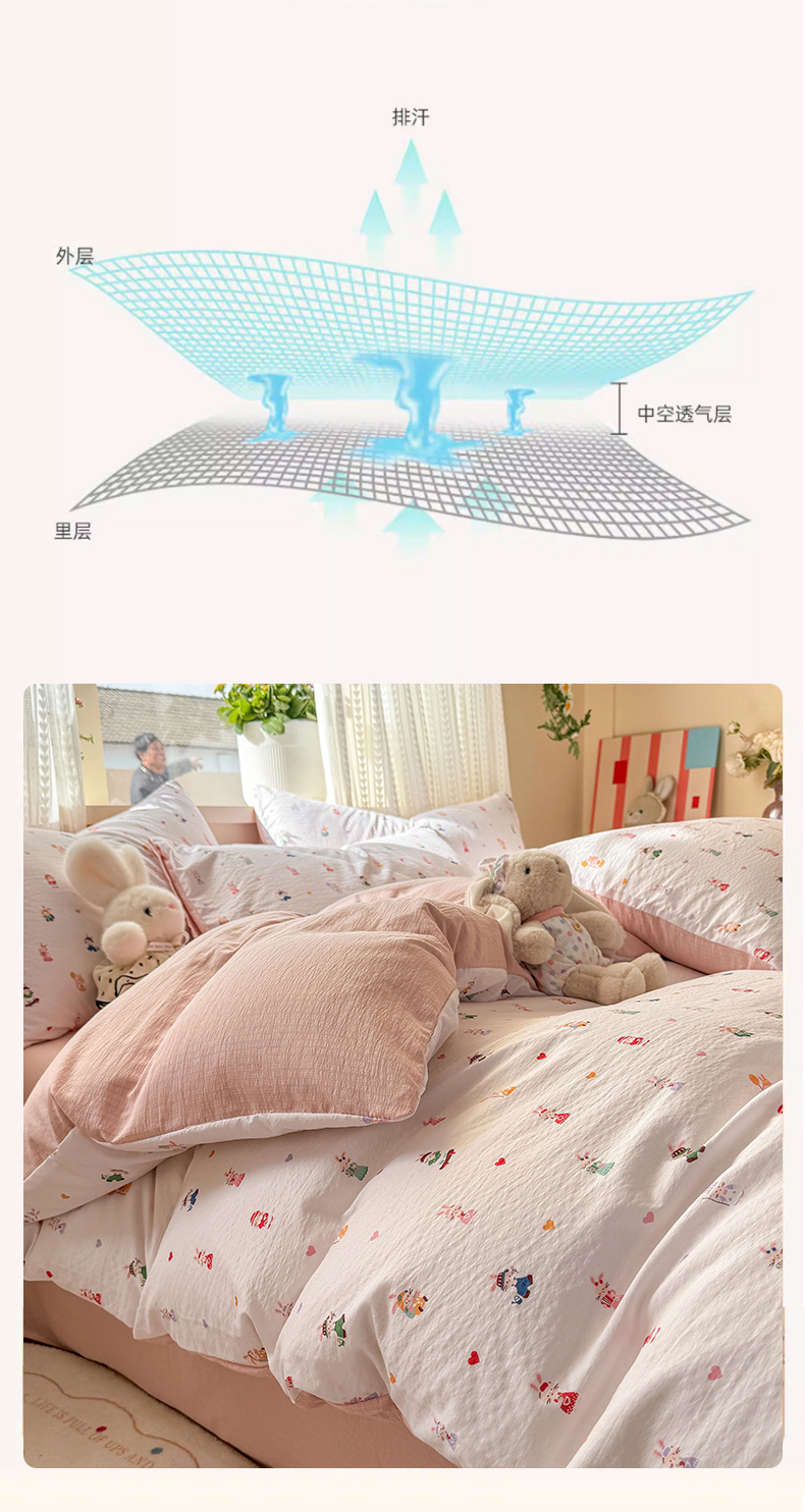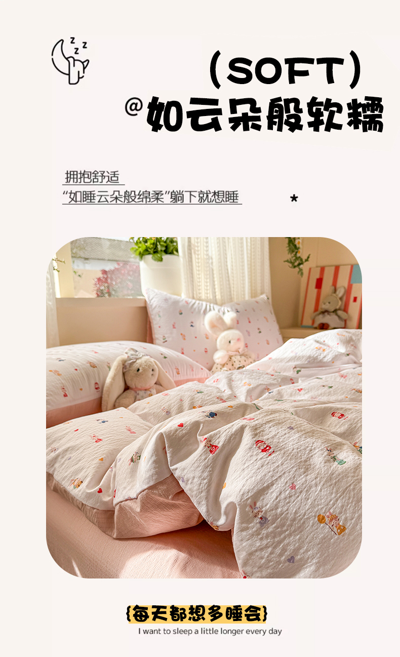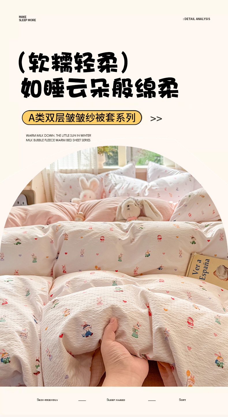 丽美人家纺 2026新款A类皱皱纱双层印花单被套 BT桃心萌兔集