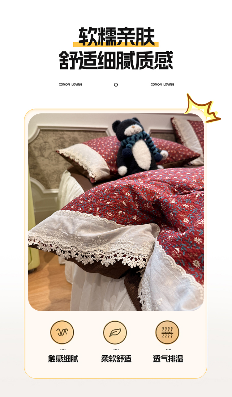 当前位置: 91家纺网 > 商品网购 > 床品套件 > 四件套 > 其它四件套 > 盼季家纺 2026新款亲肤木棉法式复古蕾丝花边皱皱纱四件套 复古蕾丝花边-伊莫花语