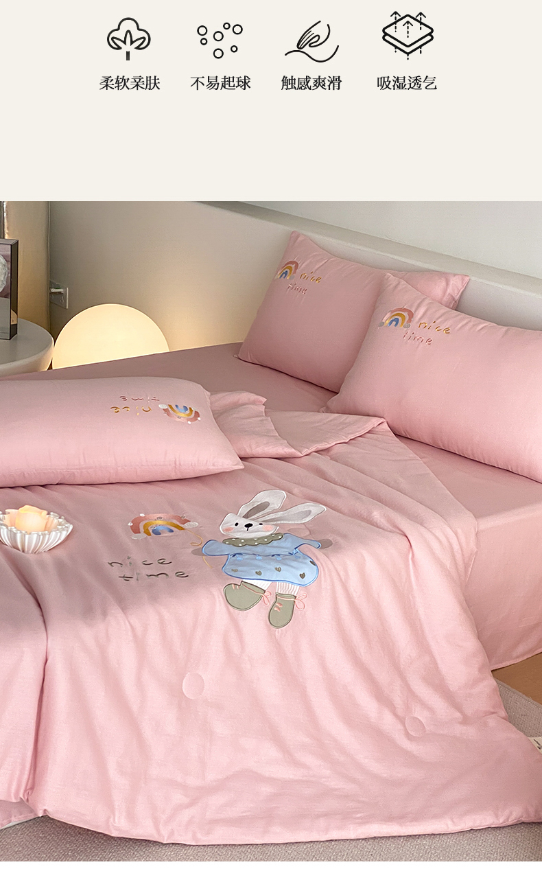 • 91家纺网 家纺一手货源 找家纺 (总)鸣升家纺 2026新款全棉夏被双层纱贴布绣100%棉花夏被四件套,彩虹兔兔-粉,彩虹小熊-卡其,快乐企鹅-灰,蘑菇小兔-咖,熊熊乐园-绿,月牙兔兔-水绿,组合图