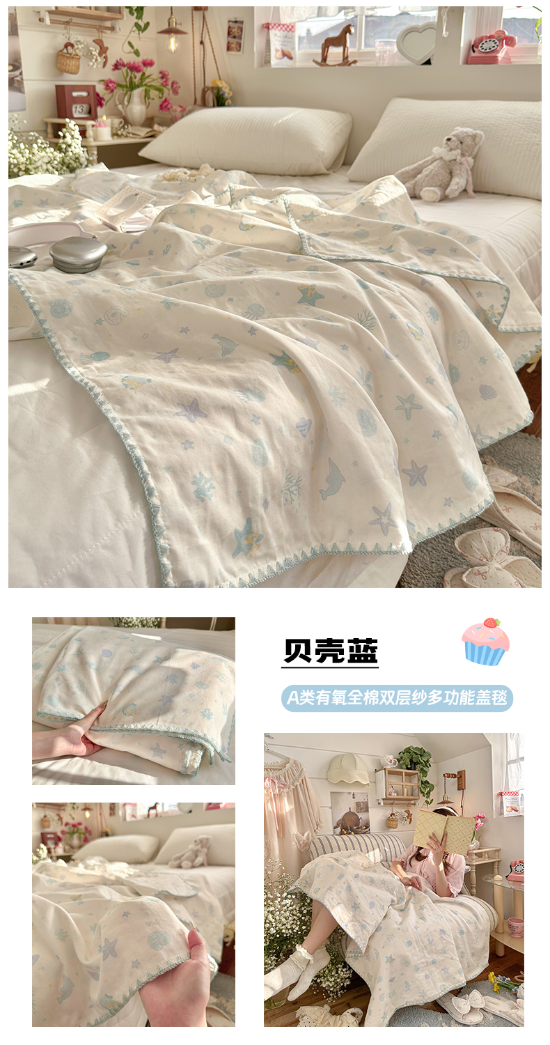 (总)暖阳 2026新款全棉纯棉双层纱夏季毯盖毯毯子,贝壳蓝,蝶扑衣,花境布偶,绿姿,莓莓兔软糖,瑞莎蓝,星仔软糖,烟霞漫舞绿,月铃喵喵,云棉莓朵粉