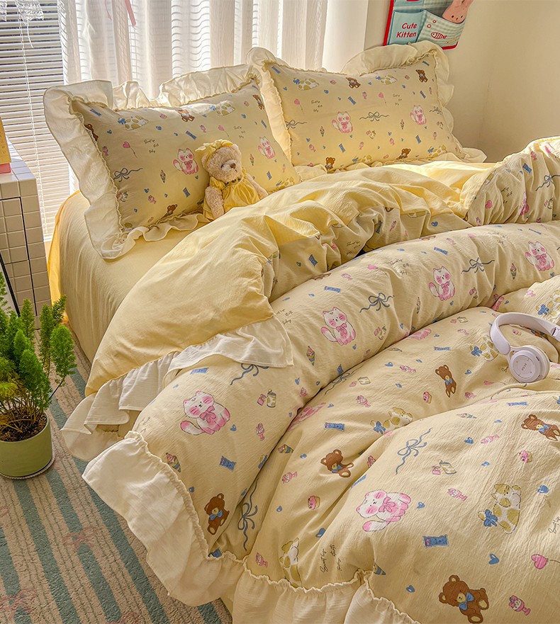 当前位置: 91家纺网 > 商品网购 > 床品套件 > 四件套 > 双层纱四件套 > 老K (原美阁) 2026新款木棉双层纱四件套卡通韩版公主风四件套 草莓派对猫