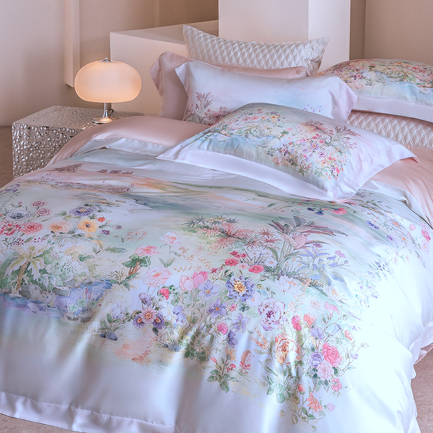 (总)时亿家居 2026新款大版莱赛尔天丝印花四件套,蓝姗园 玉,蓝姗园 粉,苏芸 粉,苏芸 玉,夏怡花园 粉绿,夏怡花园 黄绿