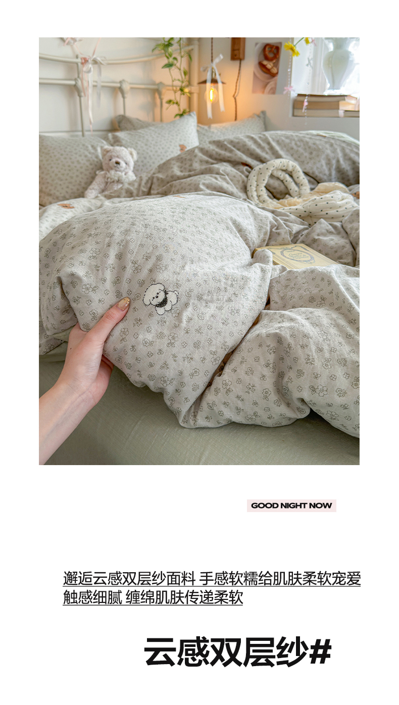当前位置: 91家纺网 > 商品网购 > 床品套件 > 四件套 > 双层纱四件套 > 优选 2026新款小清新直播热卖款云感双层纱木棉床盖四件套系列 两只汪汪