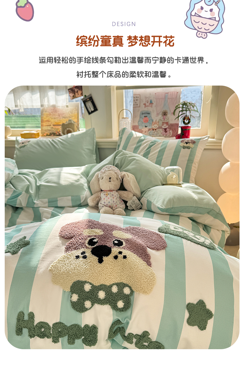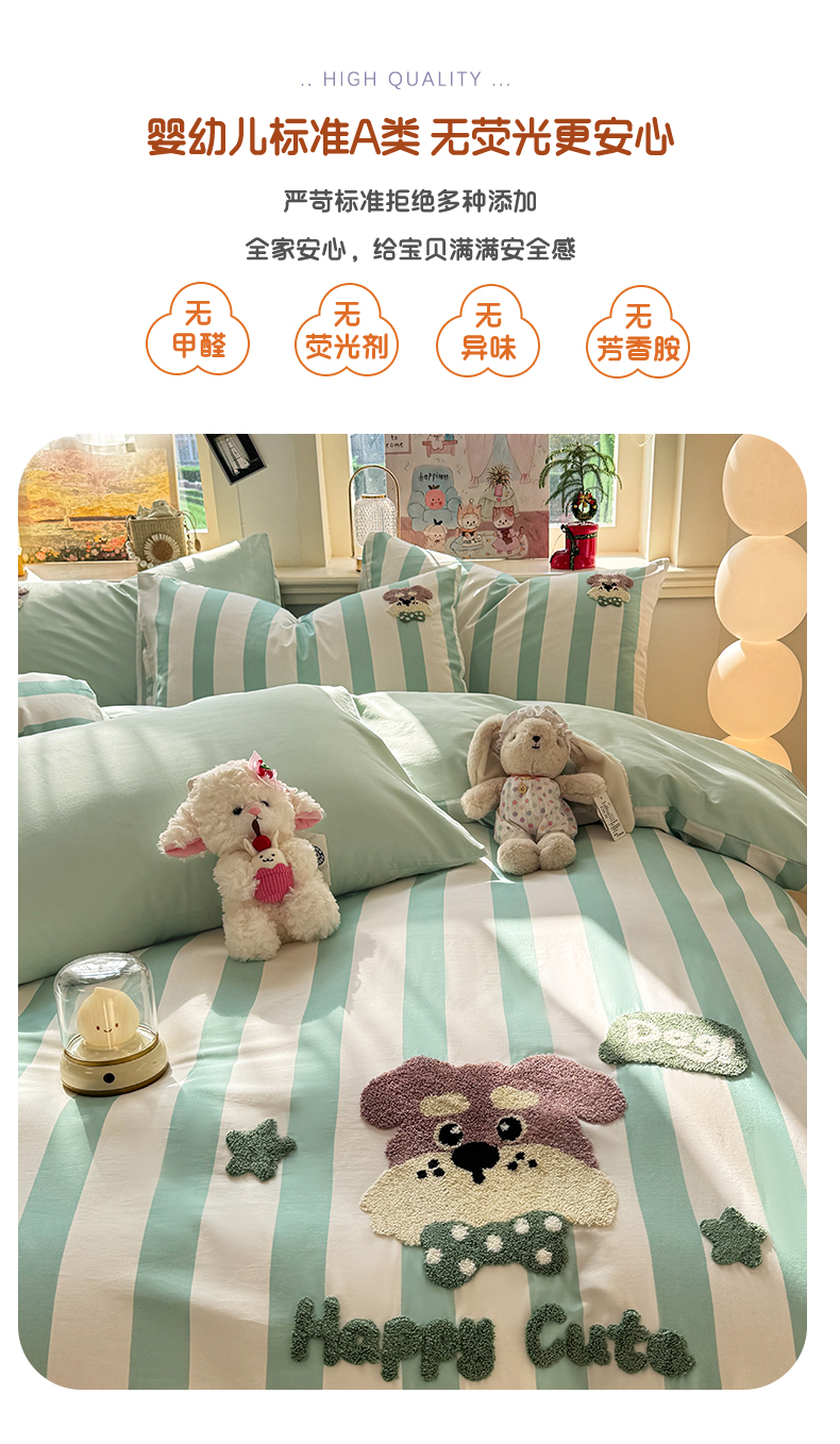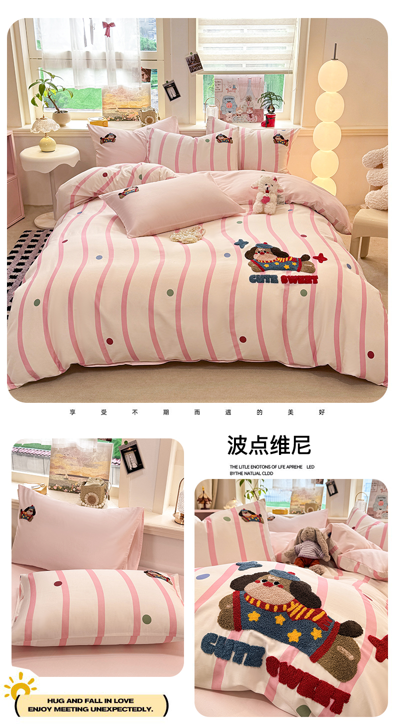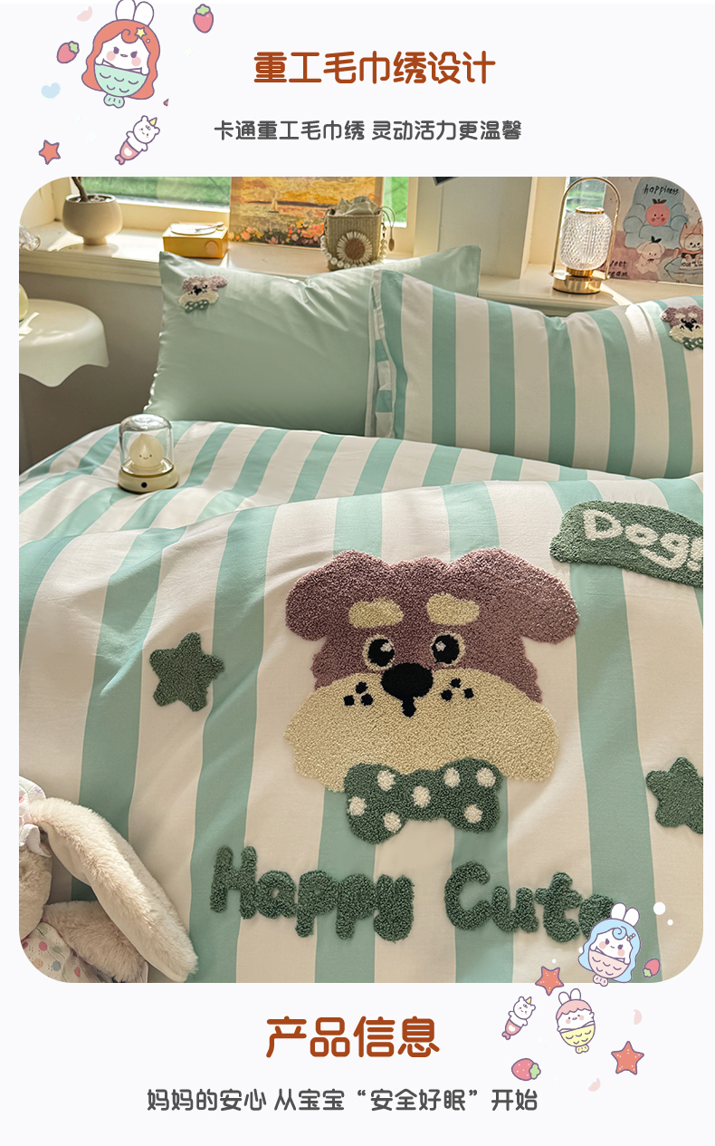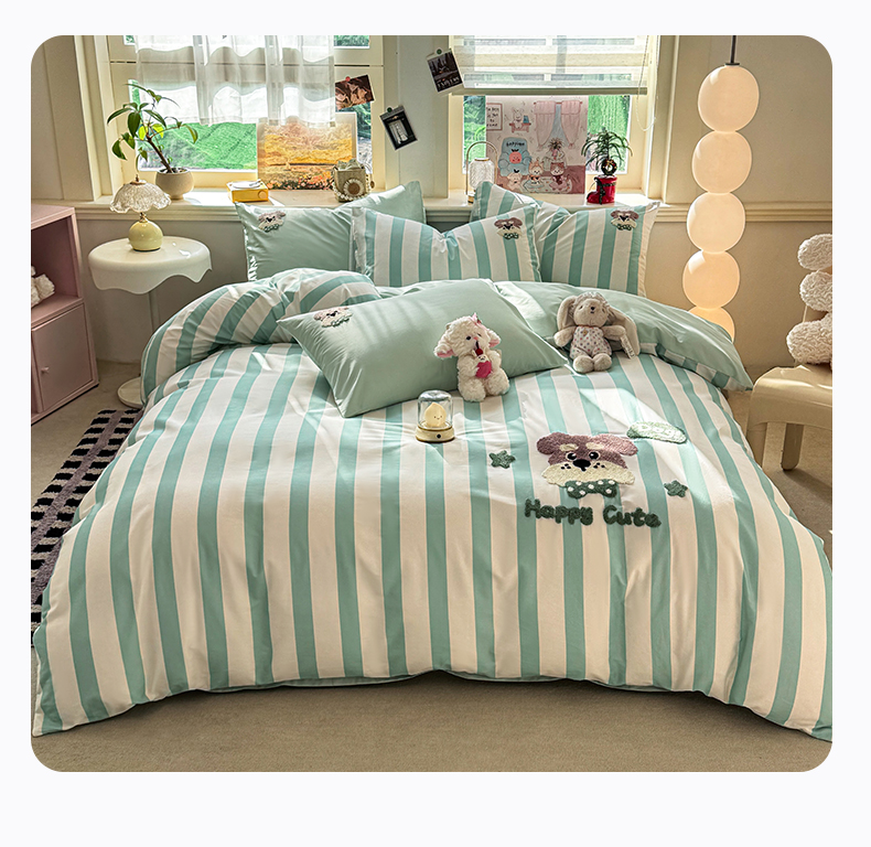 当前位置: 91家纺网 > 商品网购 > 床品套件 > 四件套 > 全棉普通四件套 > 卧趣家纺 2026新款A类100Pro贡缎全棉纯棉卡通毛巾绣四件套 条纹俏皮狗