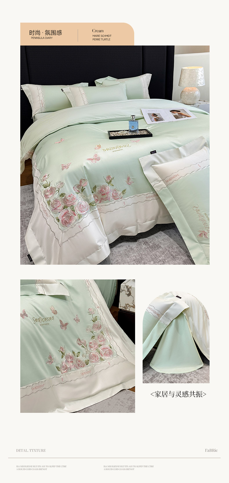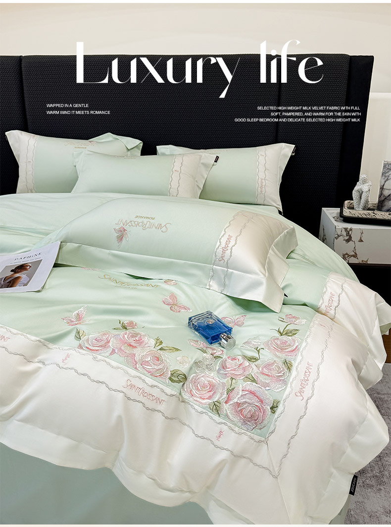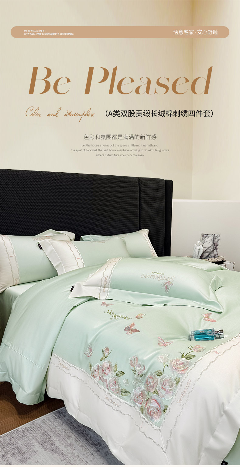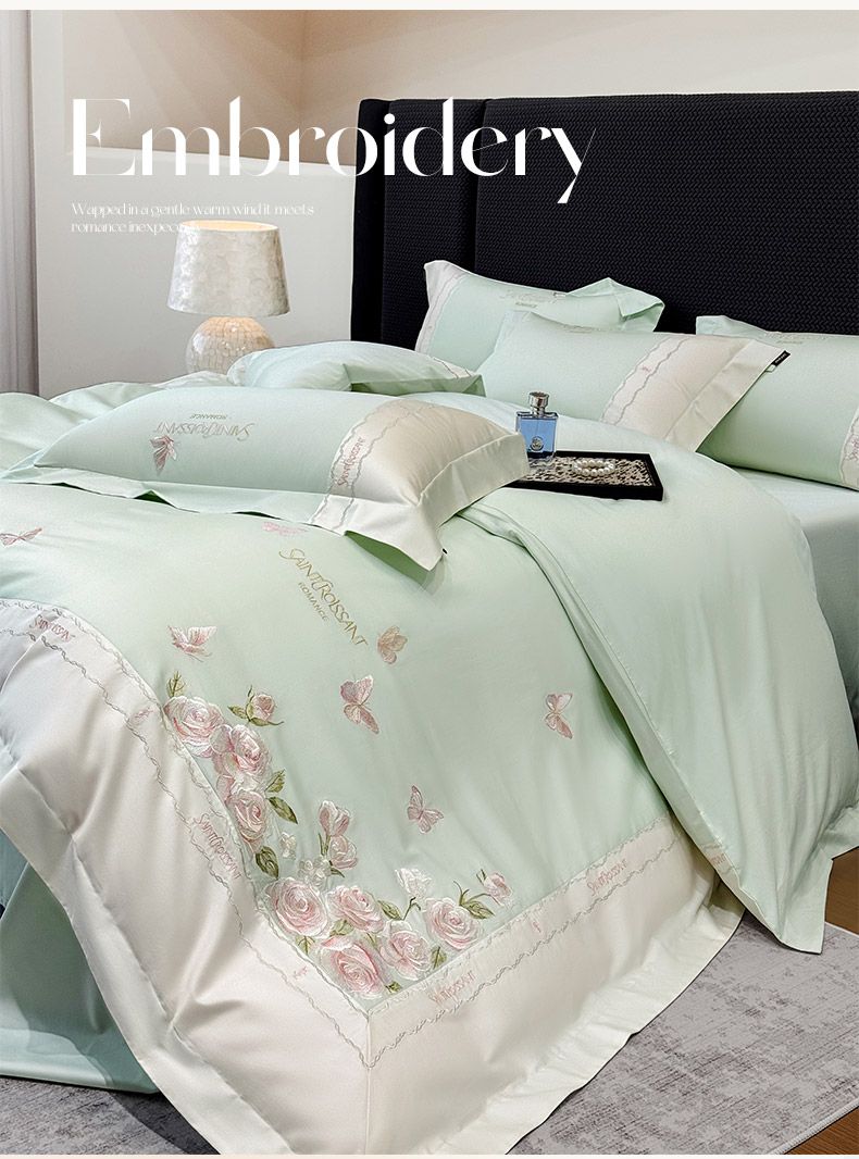 当前位置: 91家纺网 > 商品网购 > 床品套件 > 四件套 > 长绒棉四件套 > 2026爆款新品A类50S双股长绒棉纯棉四件套100全棉重工花卉刺绣被套床单床笠小清新床上用品溪畔玫瑰 溪畔玫瑰-茶绿