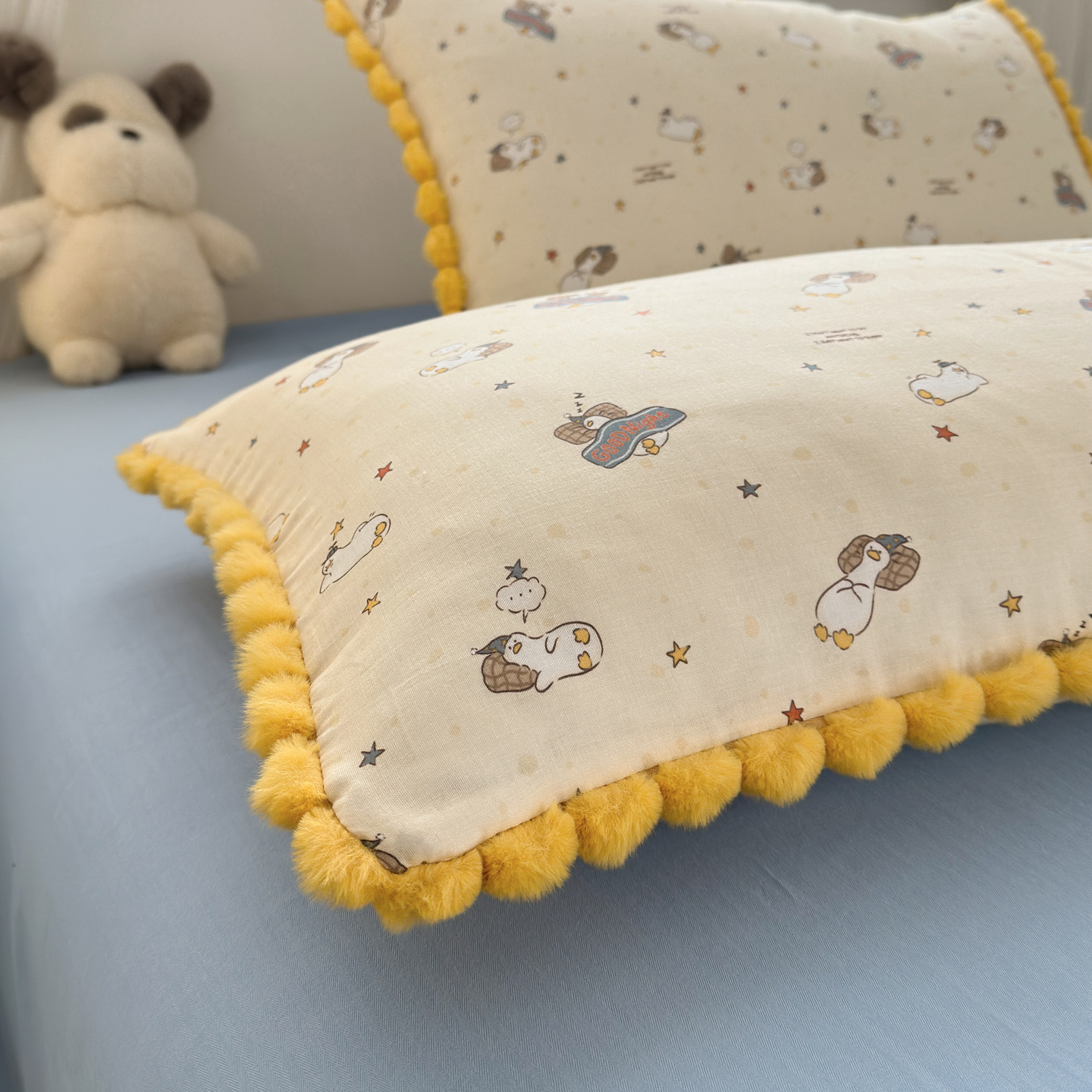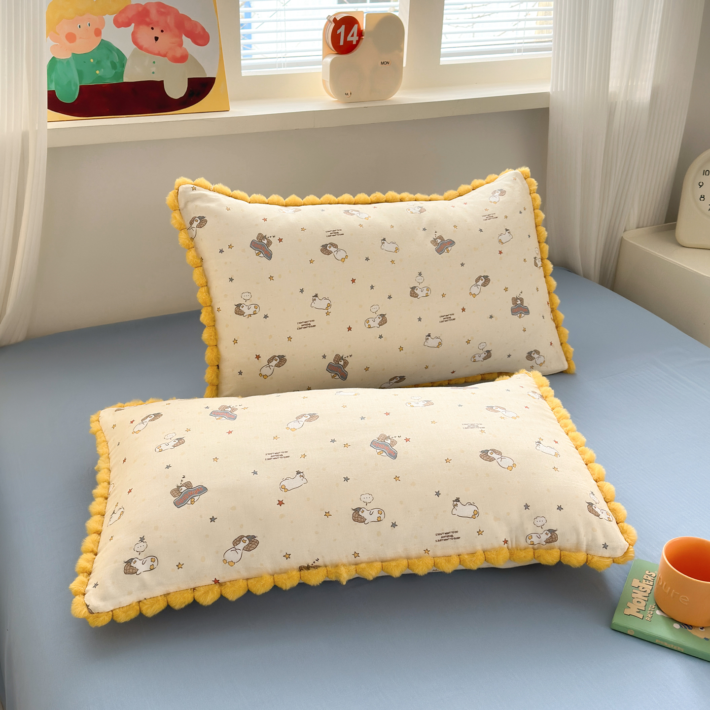 (总)丽涵家纺 2026新款全棉纯棉双层纱毛球花边单品枕套枕套单件,晚安鸭-黄,晚安鸭-绿,小怪兽,小象马戏团,小熊郊游,熊猫笨笨,音乐小象-绿,音乐小象-紫,组合图仅供展示不可下单
