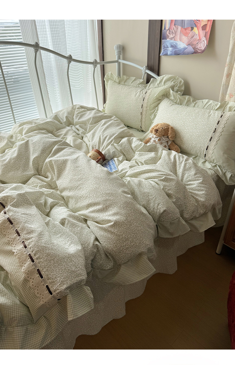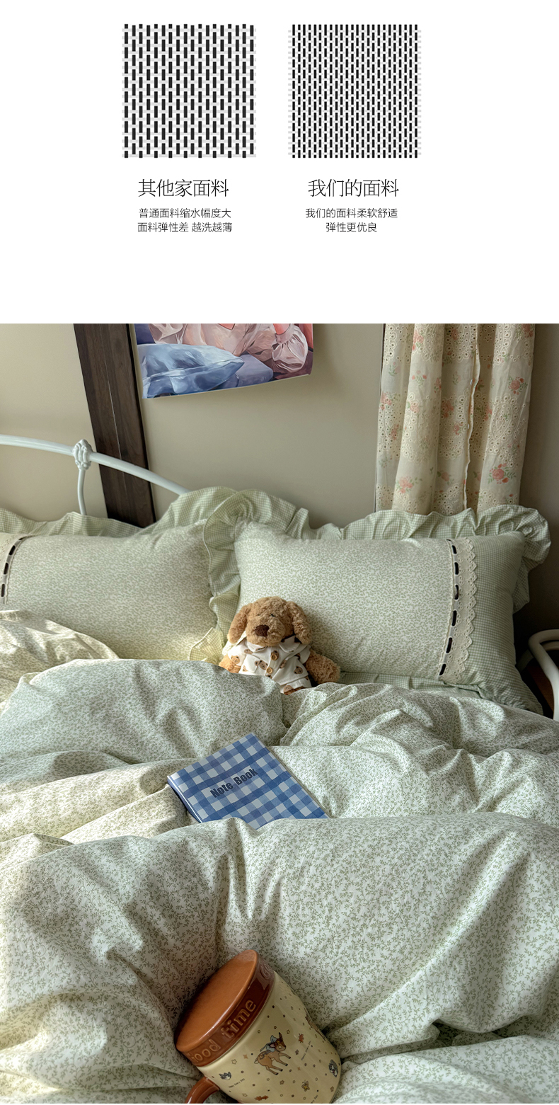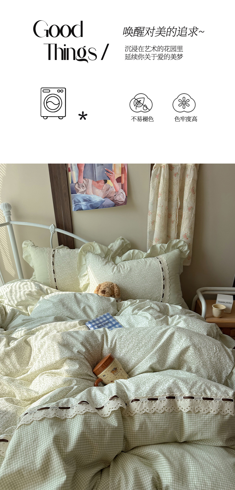 当前位置: 91家纺网 > 商品网购 > 床品套件 > 四件套 > 其它四件套 > 韩都家居 2026春夏新款韩式小碎花水洗古棉花边四件套 秘境-青草绿