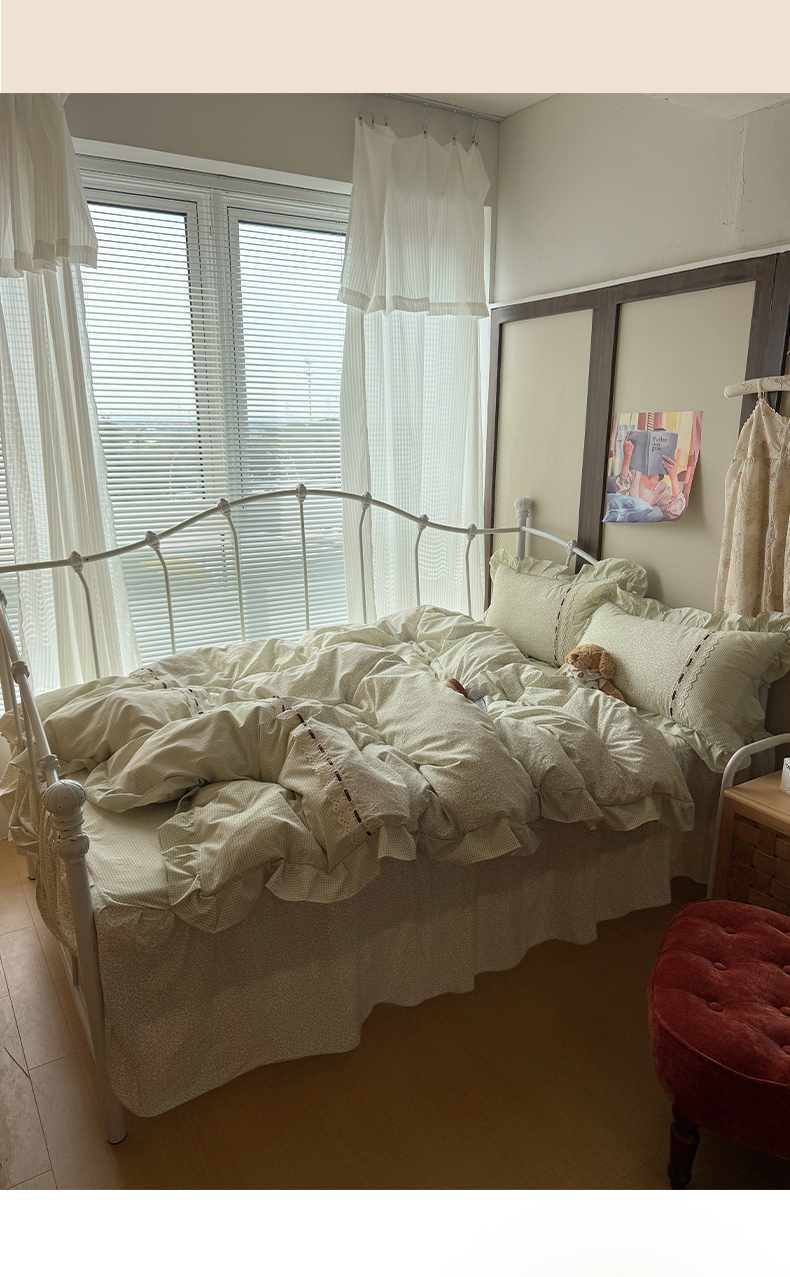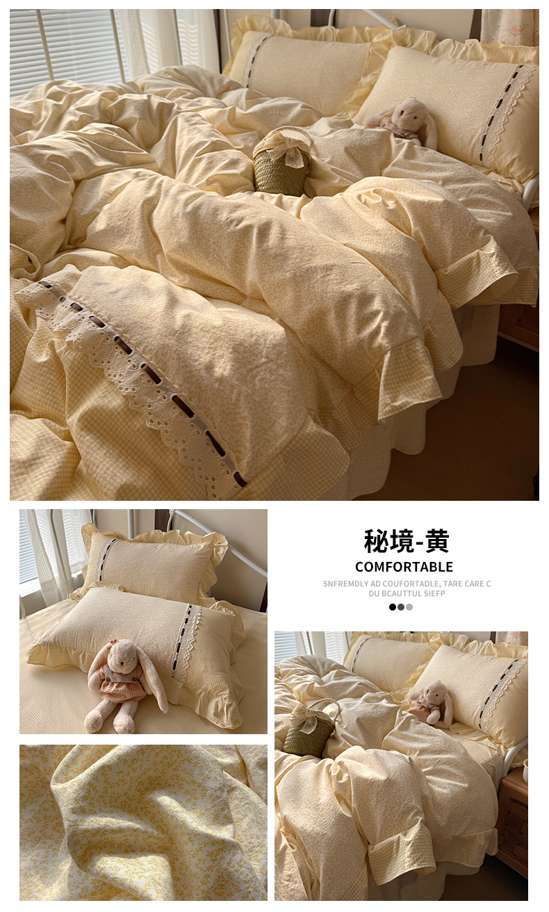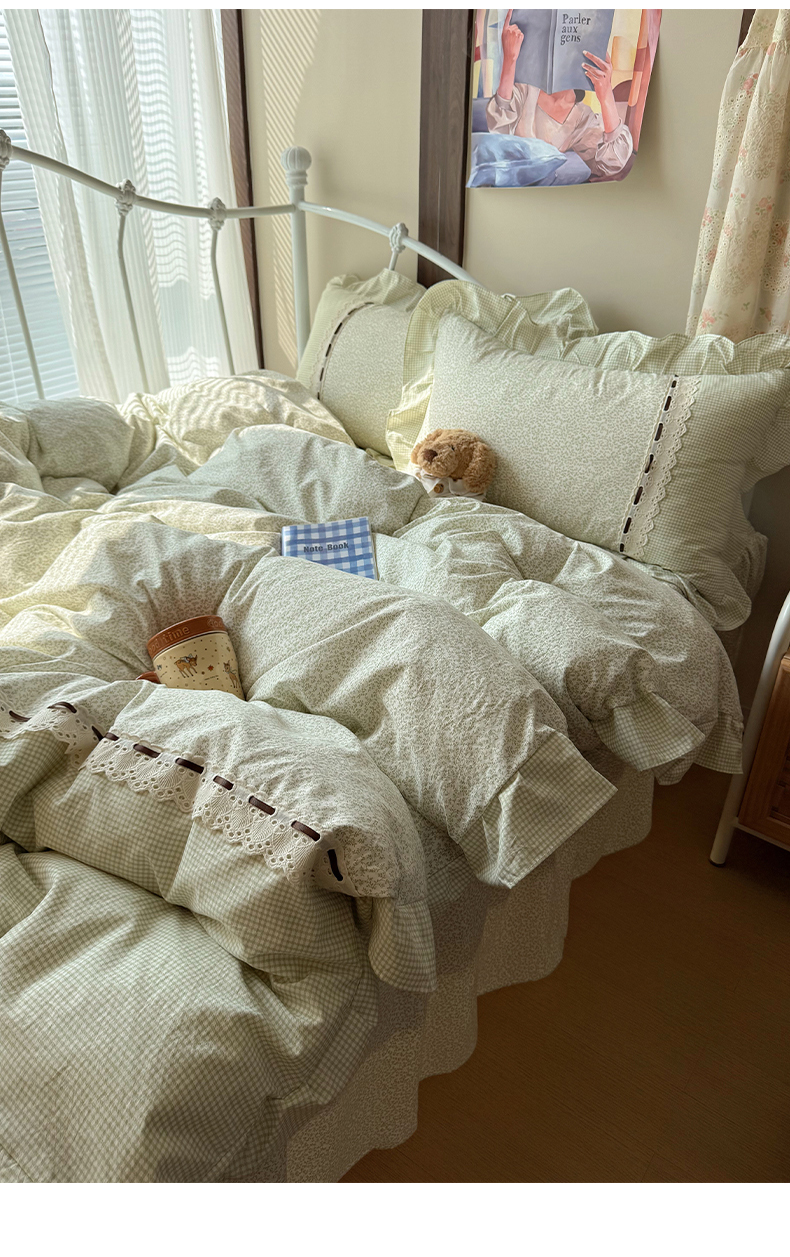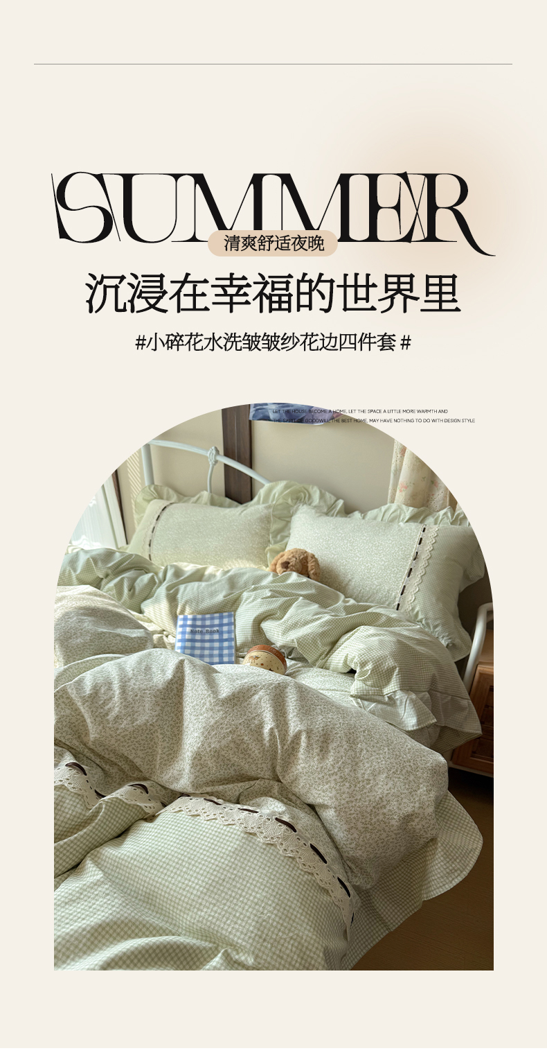 当前位置: 91家纺网 > 商品网购 > 床品套件 > 四件套 > 其它四件套 > 韩都家居 2026春夏新款韩式小碎花水洗古棉花边四件套 秘境-青草绿