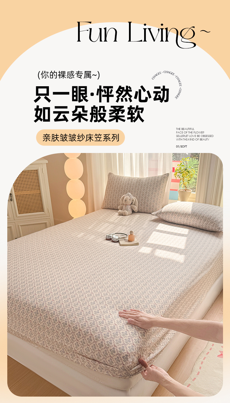 (总)丝芙妮家居 2026春夏新款皱皱棉双层纱泡芙棉床笠 床笠单件,晨光-黄,晨光-灰,花簇,怀旧-兰,牧歌,顽宠,雅蔓,樱桃,云蝶-粉,云蝶-兰,知锦,组合图仅供展示不可下单