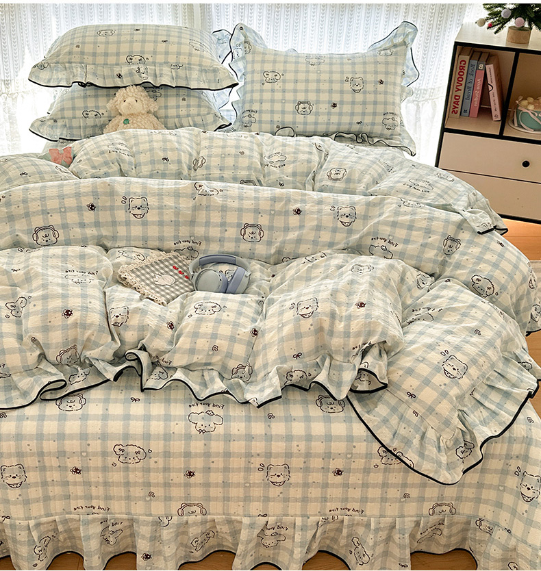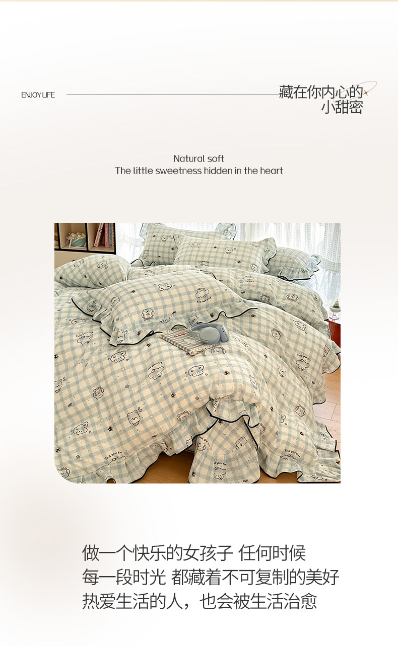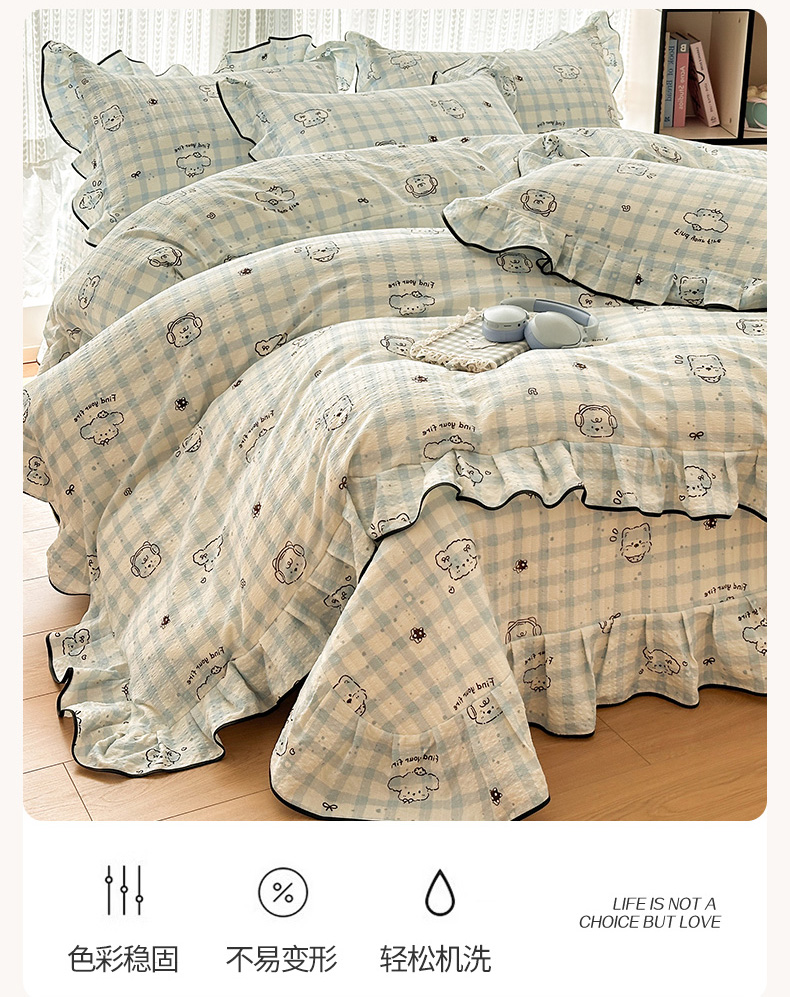 当前位置: 91家纺网 > 商品网购 > 床品套件 > 四件套 > 其它四件套 > 牵依 2026春夏新款A类云感花边款双层纱床盖四件套 花团木马