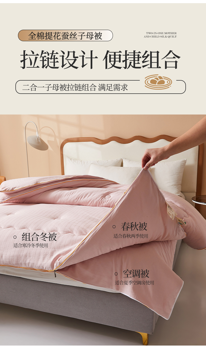 小禹仔家纺 2026新款全棉提花蚕丝被拉链二合一子母被冬被春秋被夏被被子被芯加厚棉被 柔肤粉