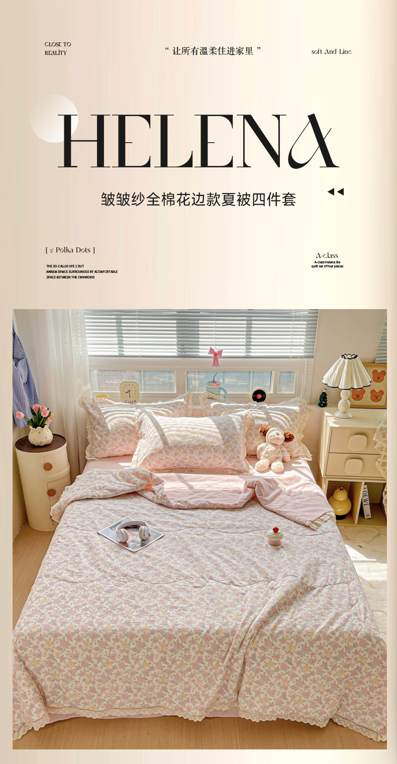 (总)2026新款云感皱皱纱全棉花边款夏被四件套,百福兰,春天里,春晓,豆蔻,蝴蝶梦,可颂,兰黛,山野栀子,素颜,太妃糖,微凉薄荷,心动,遇见,芝士奶酪,紫爱心,紫苏,白茶绿,初恋,蜡笔画,莱茵河畔,桃花诺,小黑兔,春不晚,春日小熊,可颂,陌上花开,莫奈,若欢-绿,若欢紫色,舒芙蕾,田园拾趣-黄,兔小姐,郁金香小兔,波点小兔粉,波点小兔兰,花园兔,情人节,山野栀子,十里桃花粉,十里桃花紫,舒芙蕾,太妃糖,夏天,运动健将熊, 白月光,缤纷几何,格格西高地,海盐蓝小格,黎漫,木槿绿,奶油泡芙,欧若拉,桃夭,甜茶,小晴天,芋泥紫小格,紫色蝴蝶结