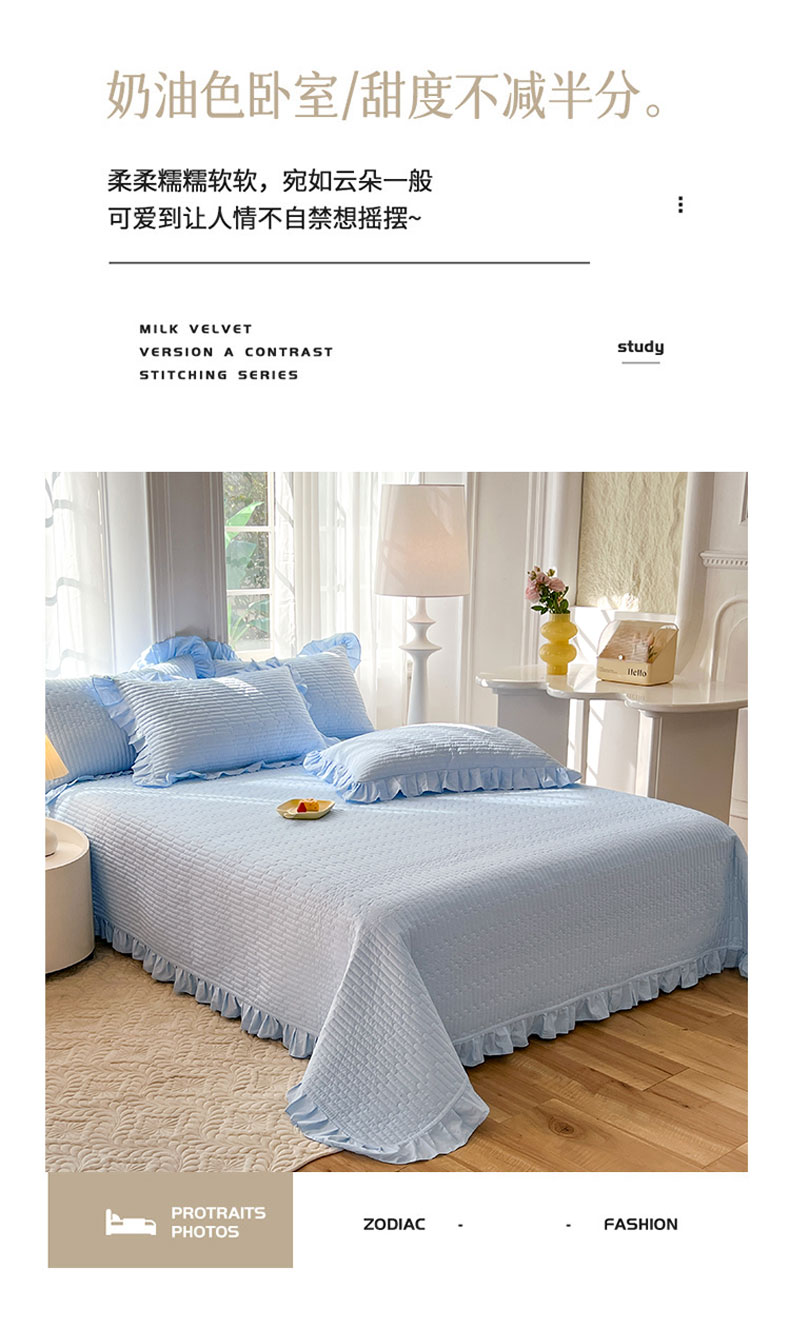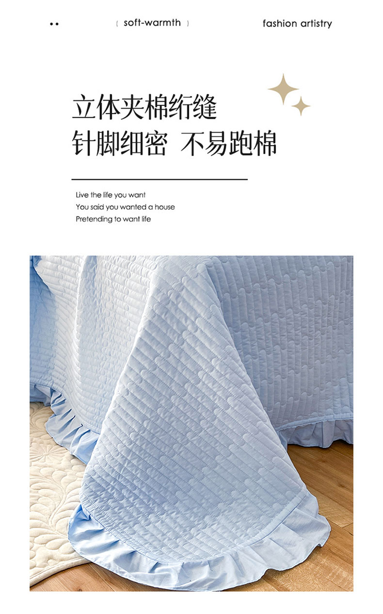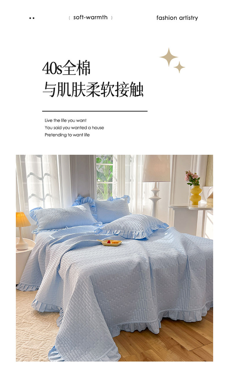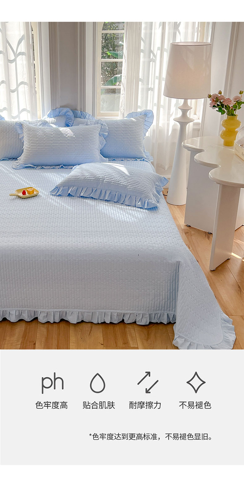 • 91家纺网 家纺一手货源 找家纺 花香四季家纺 2026新款13376全棉夹棉床盖三件套13372纯棉纯色床盖花边公主风(可定制任意尺寸) 清新蓝