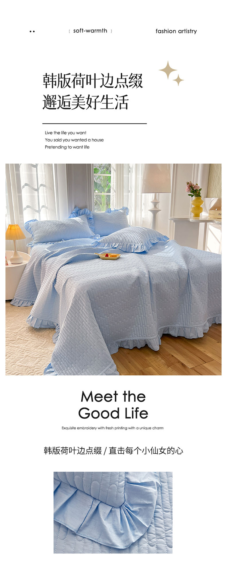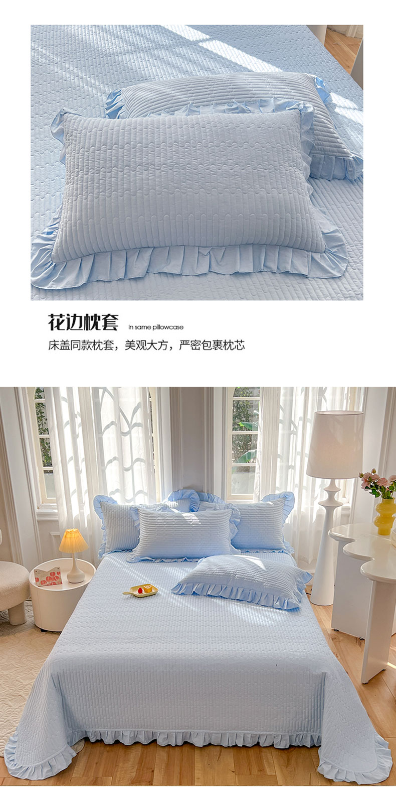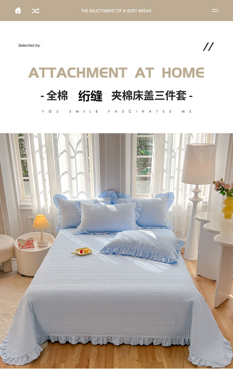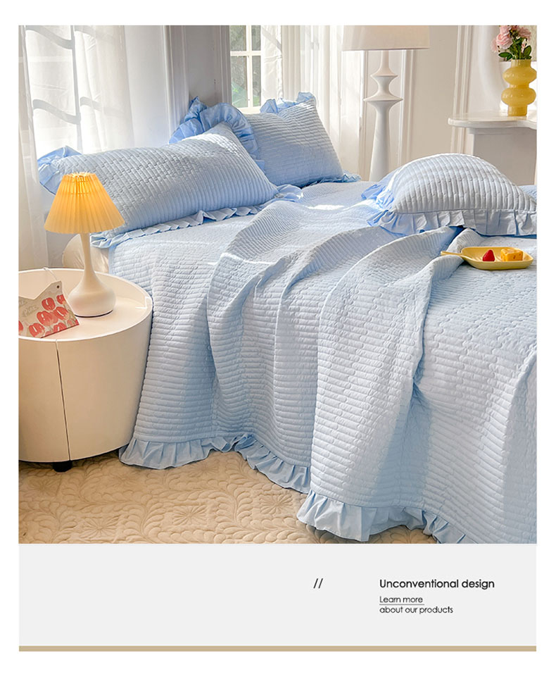• 91家纺网 家纺一手货源 找家纺 花香四季家纺 2026新款13376全棉夹棉床盖三件套13372纯棉纯色床盖花边公主风(可定制任意尺寸) 清新蓝