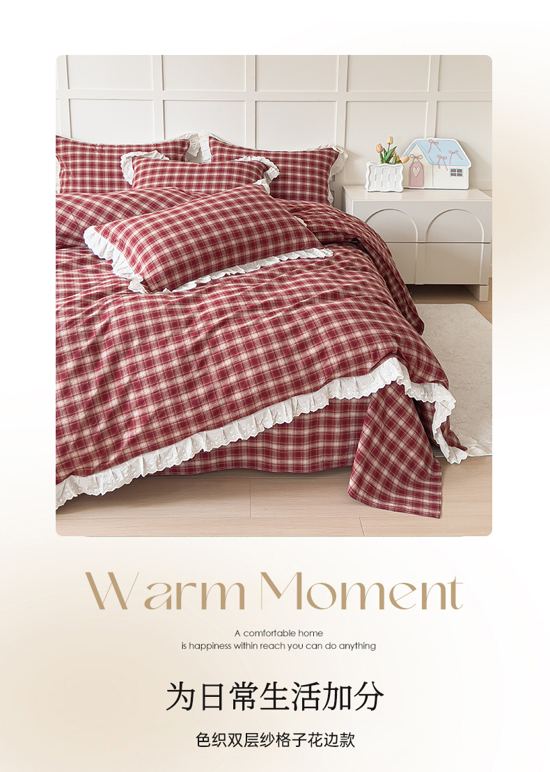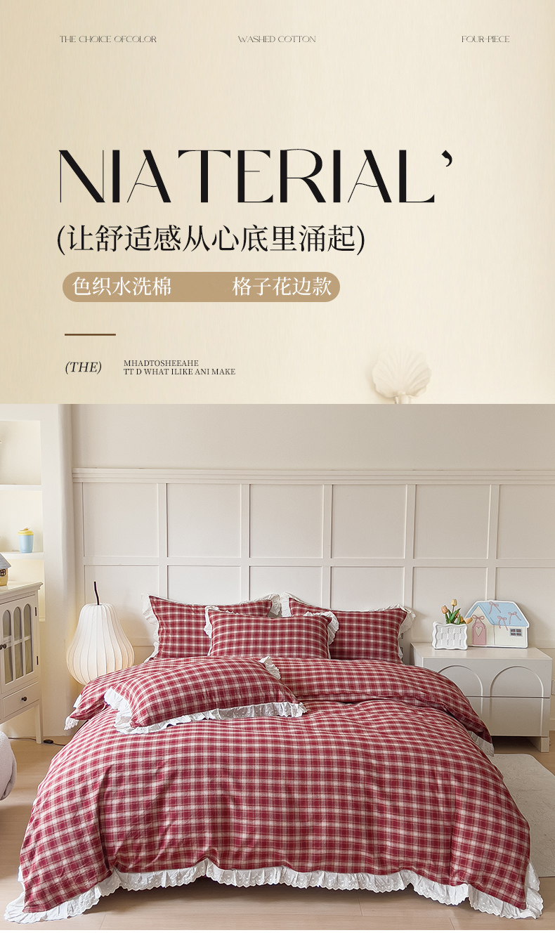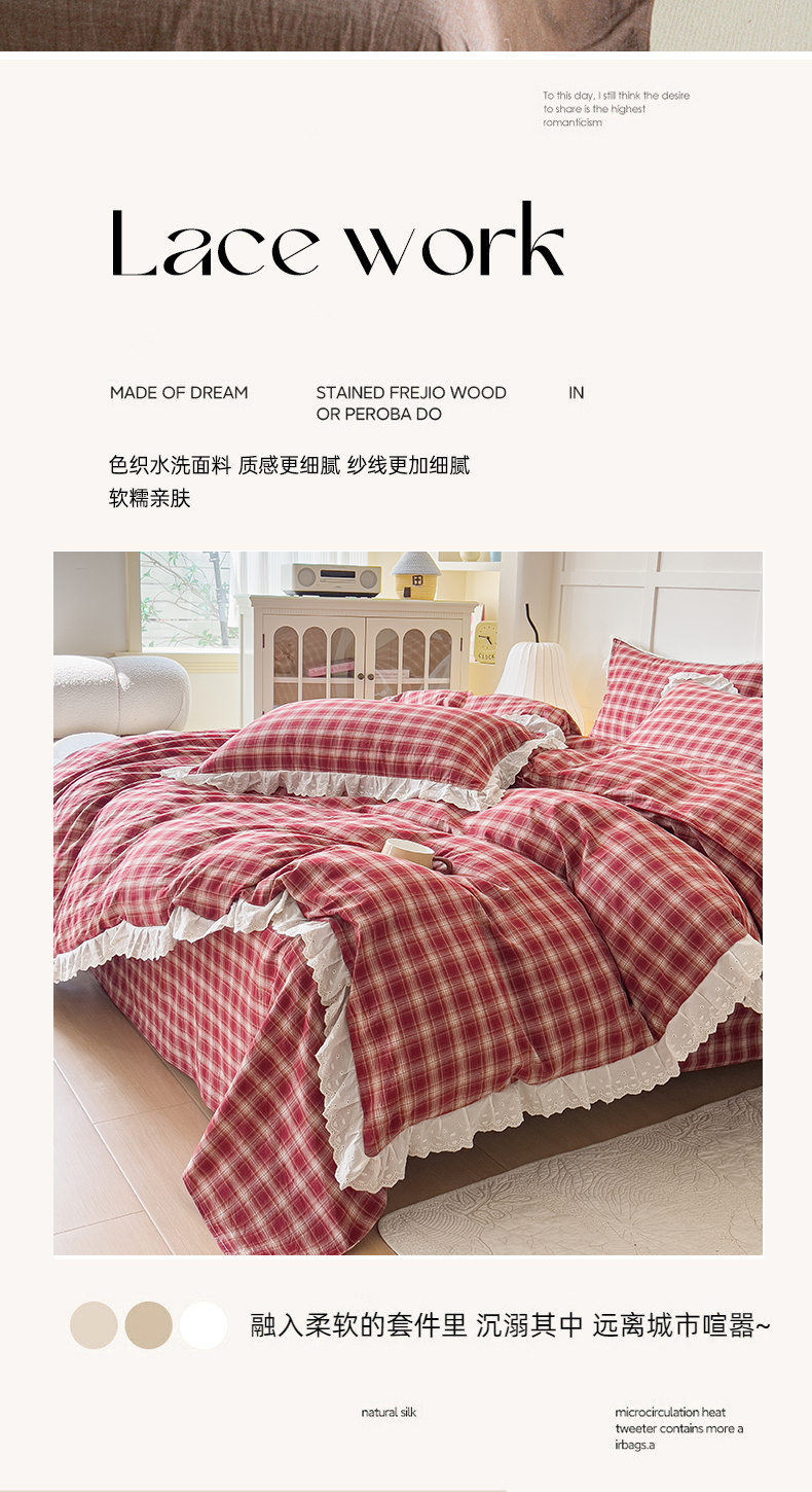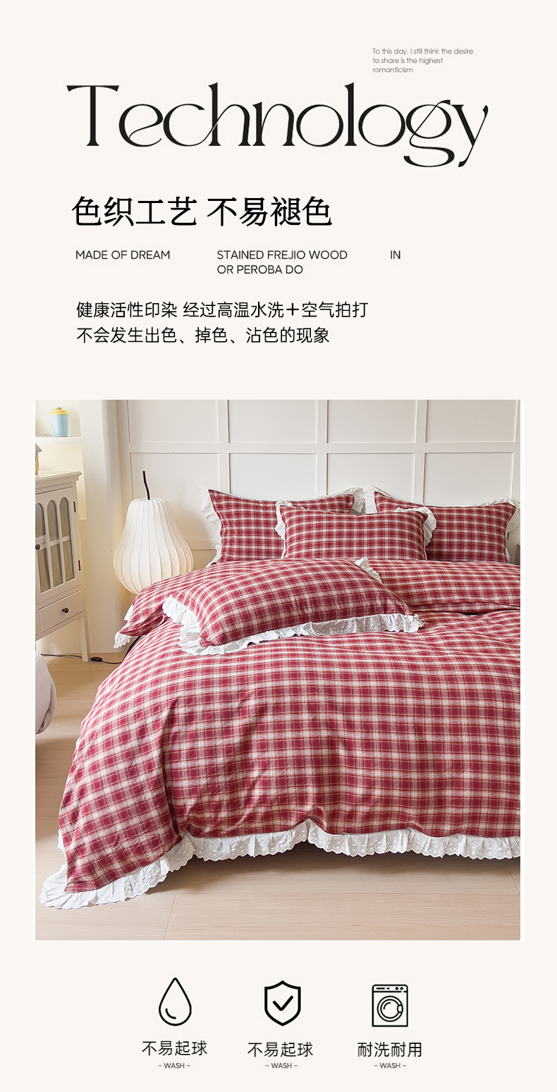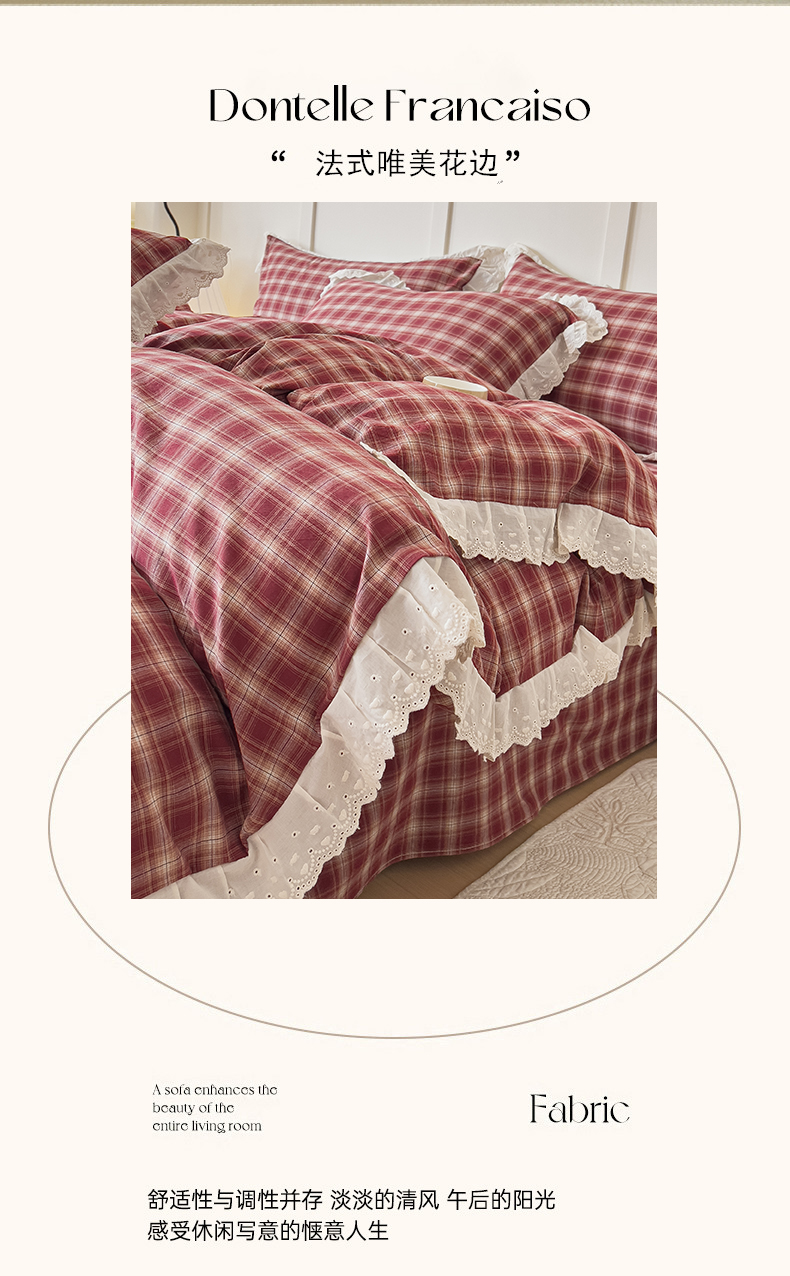 (总)花香四季家纺 2026新款法式全棉色织花边床裙款纯棉水洗棉四件套-法式庄园,法式庄园-复古红,法式庄园-复古咖