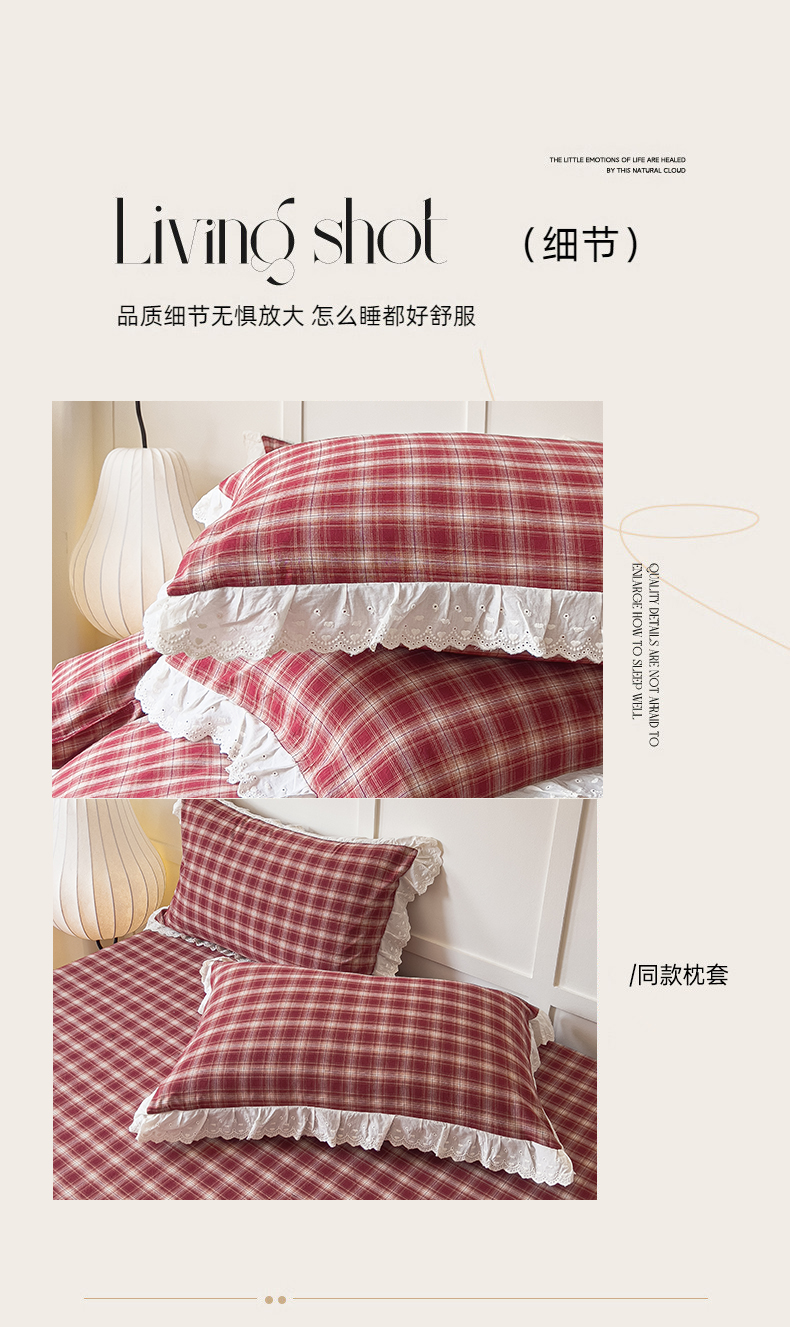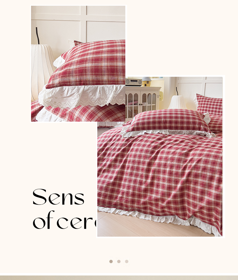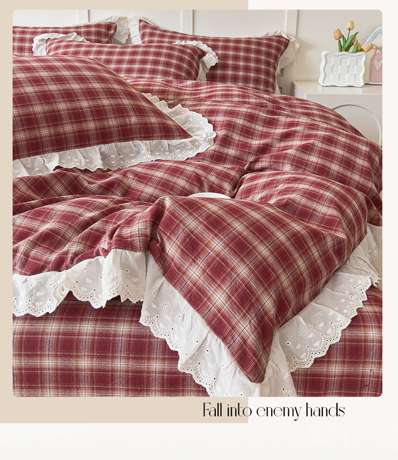 花香四季家纺 2026全棉色织水洗棉法式公主风花边床单款床笠款四件套 米兰红