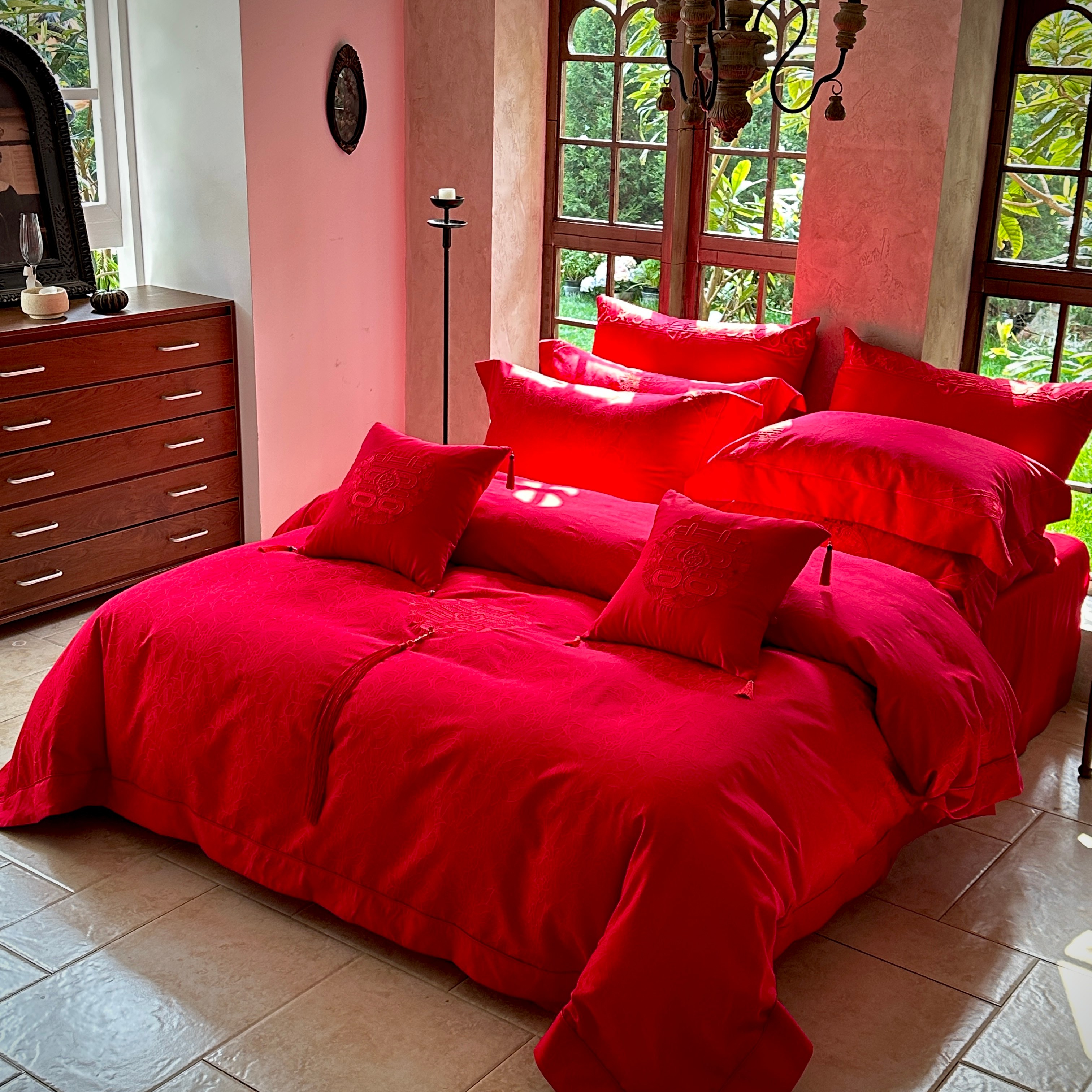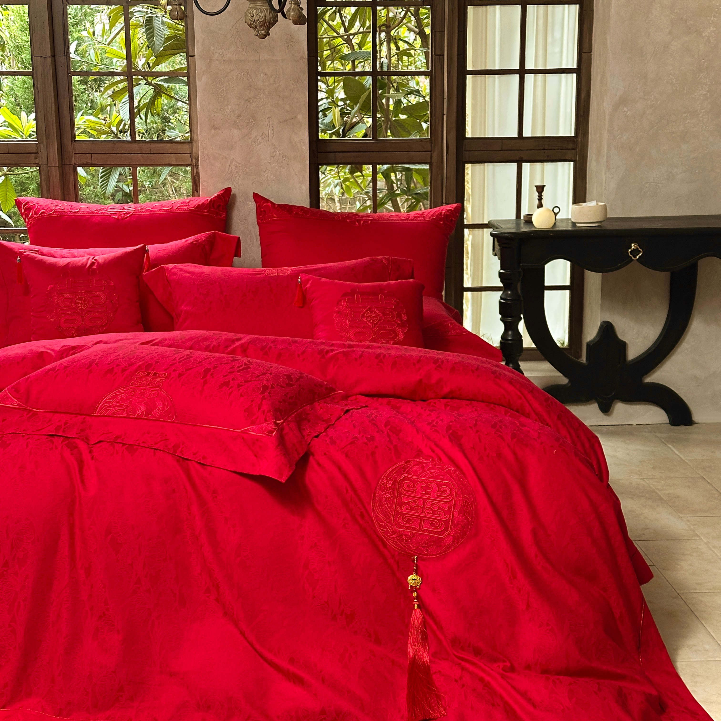 当前位置: 91家纺网 > 商品网购 > 床品套件 > 四件套 > 婚庆四件套 > 佳汐蓝家纺 2026新款高精密缎面蕾丝贴布绣法式浪漫邂逅中式喜庆四件套 爱玛诗