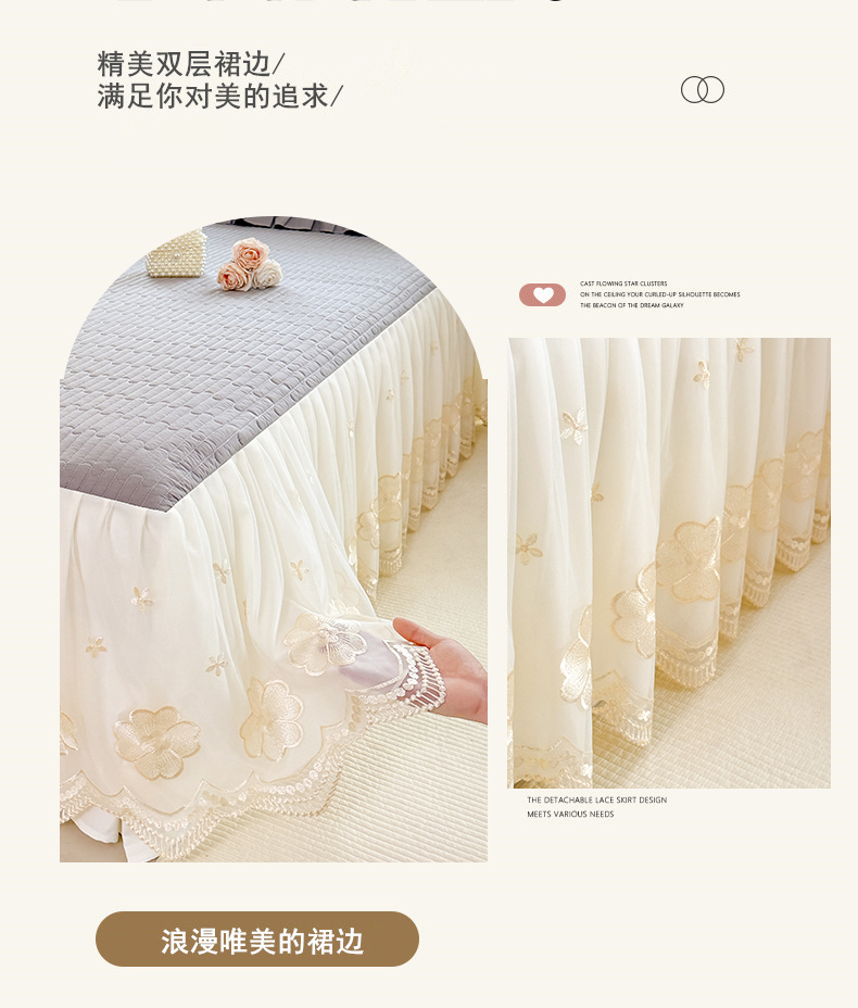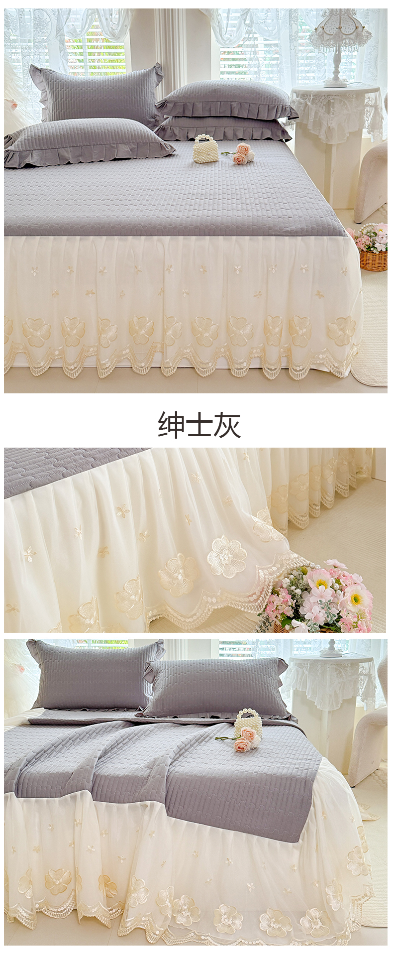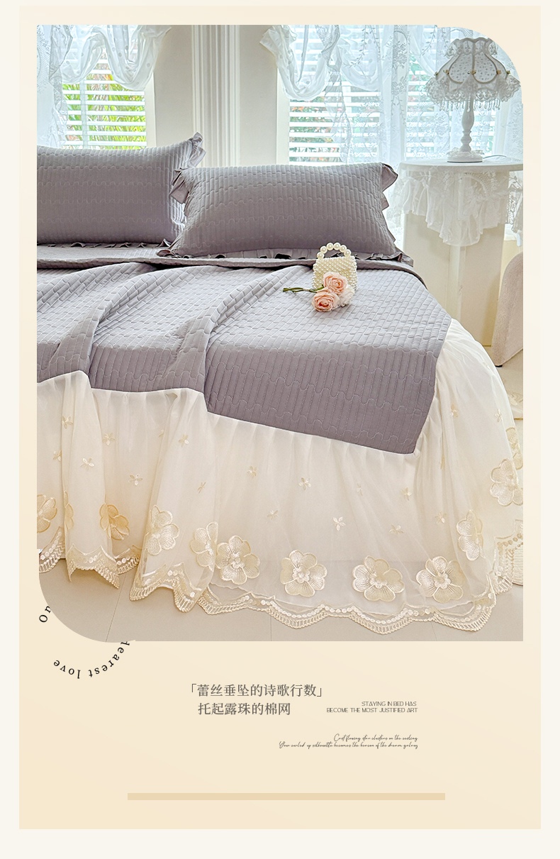 • 91家纺网 家纺一手货源 找家纺 花香四季家纺 2026新款全棉夹棉绗缝床裙三件套纯棉纯色蕾丝公主风床裙单件-蕾丝小姐 蕾丝小姐-绅士灰