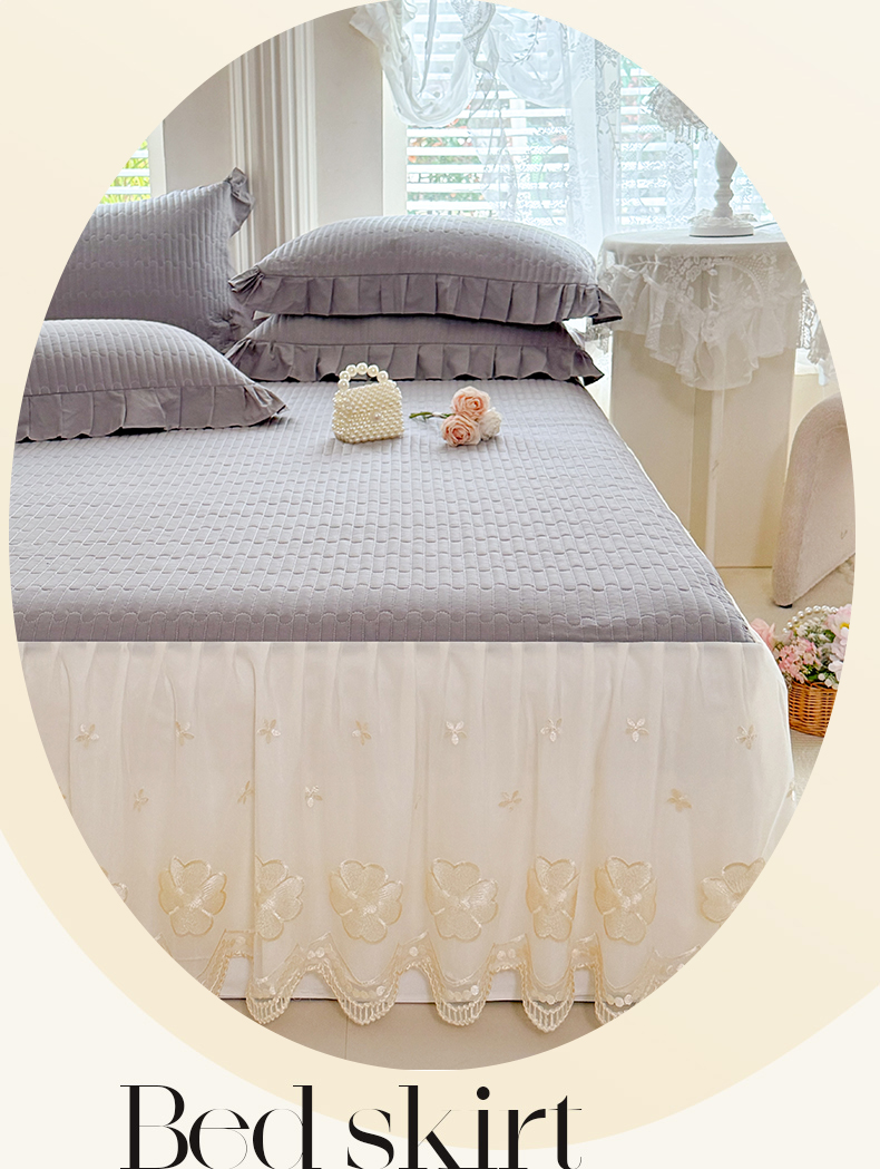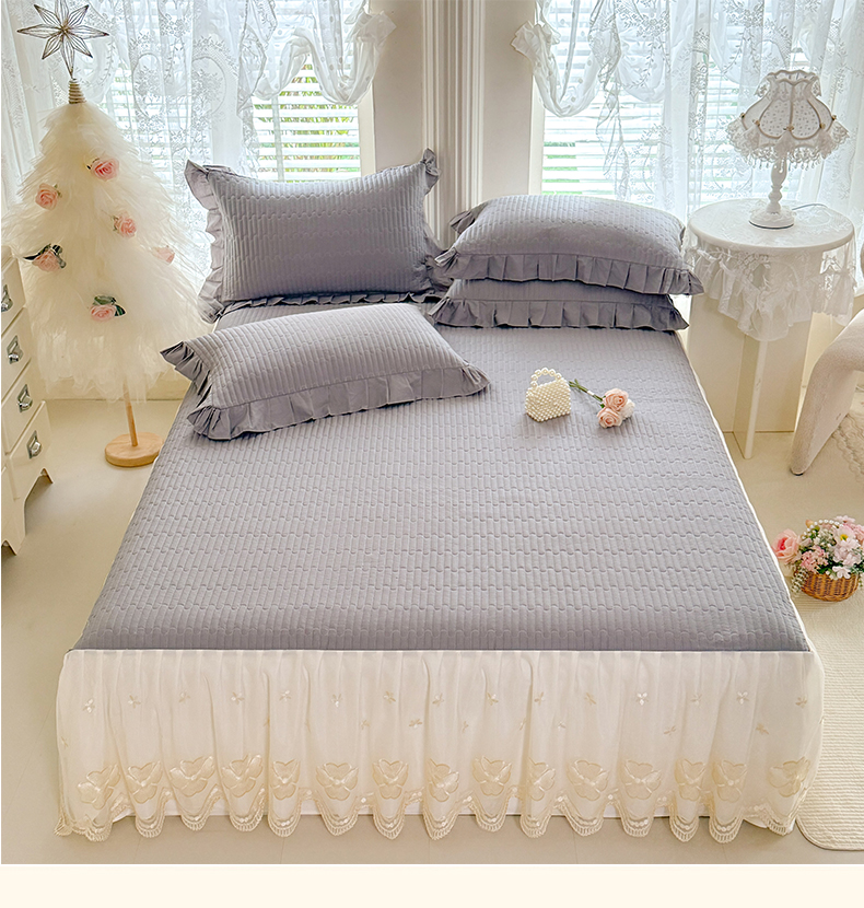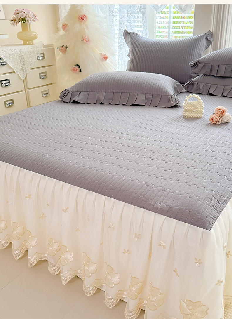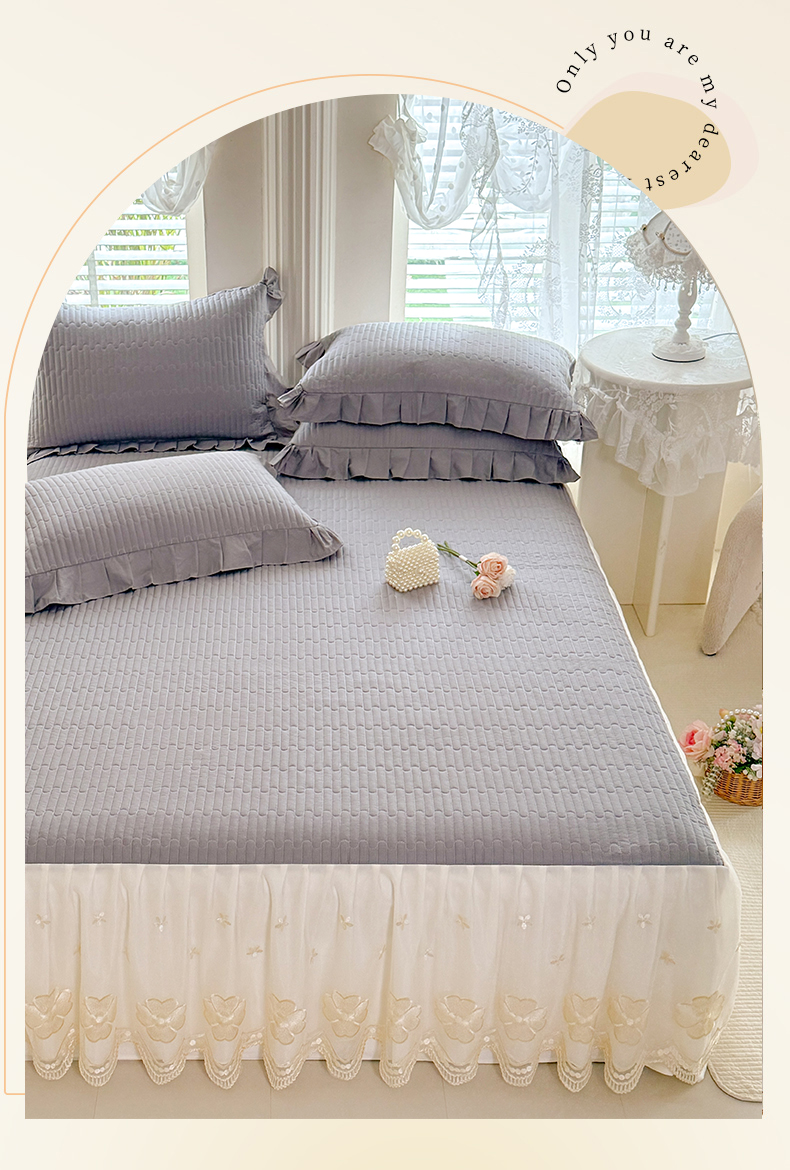 花香四季家纺 2026新款全棉夹棉绗缝床裙三件套纯棉纯色蕾丝公主风床裙单件-蕾丝小姐 蕾丝小姐-绅士灰