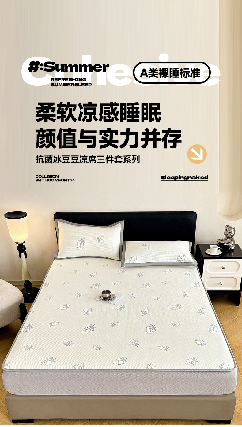 商品名称:摩妮卡 2026新款PE中分子凉感冰豆豆凉席三件套床笠三件套 冰豆豆-草莓
