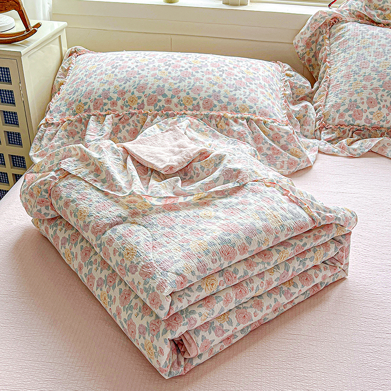 商品名称:一比一家纺 2026春夏新款法式大花边木棉皱皱纱夏被夏凉被空调被四件套 花束