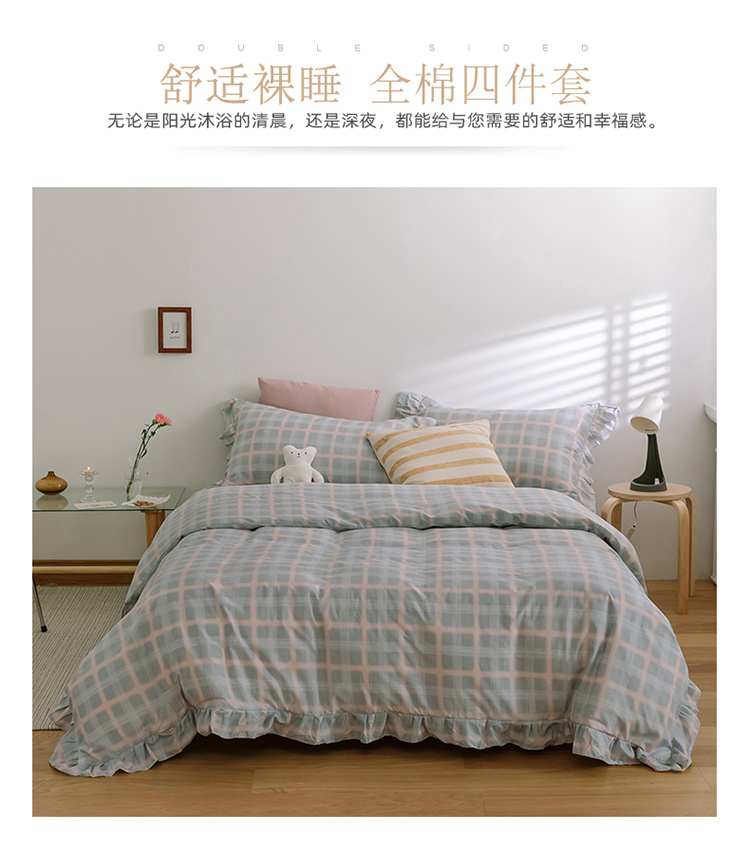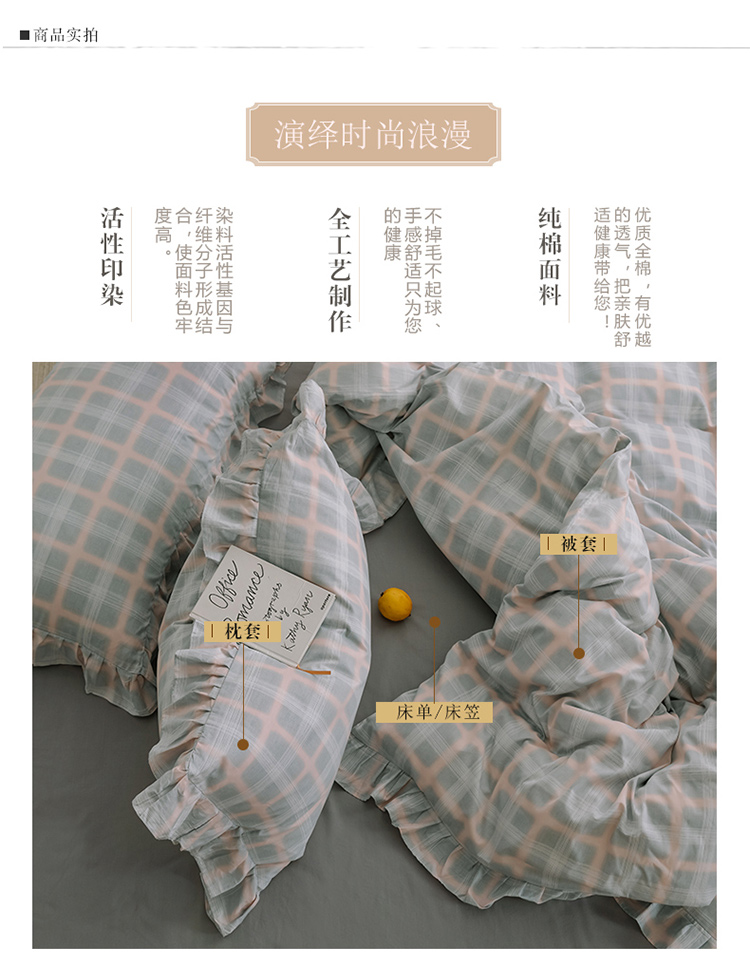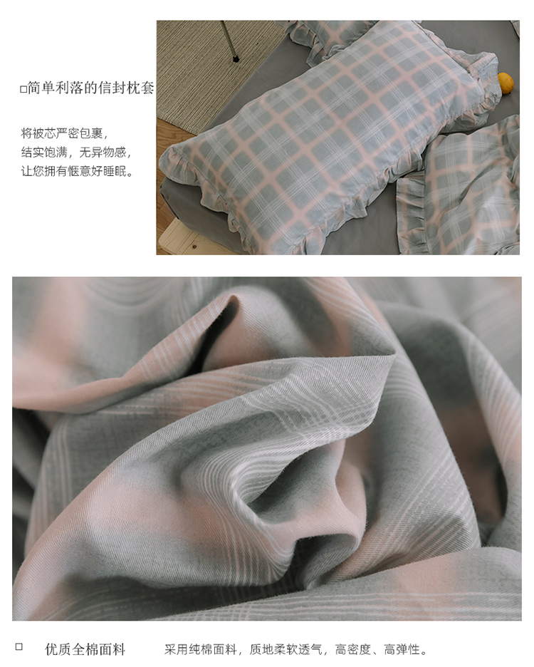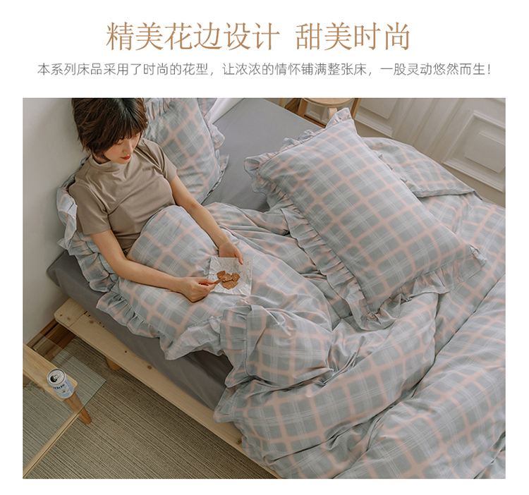 当前位置: 91家纺网 > 商品网购 > 床品套件 > 四件套 > 全棉普通四件套 > 窝米 2020新款全棉韩式公主风花边工艺款格子系列 灰格