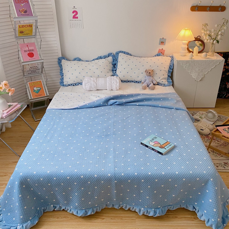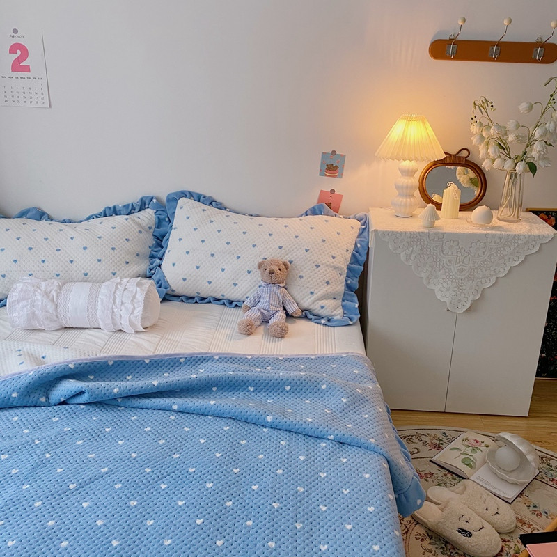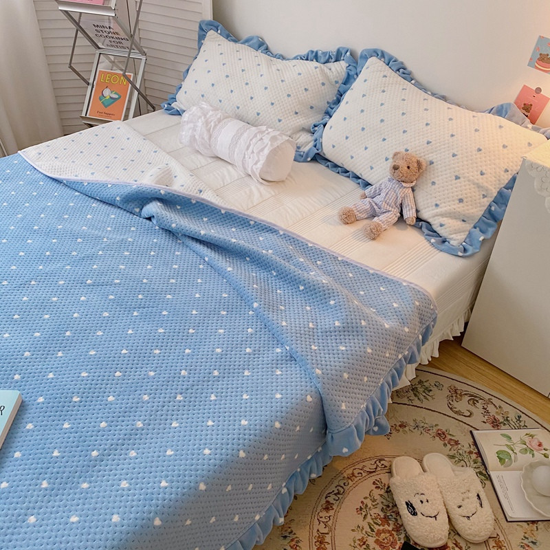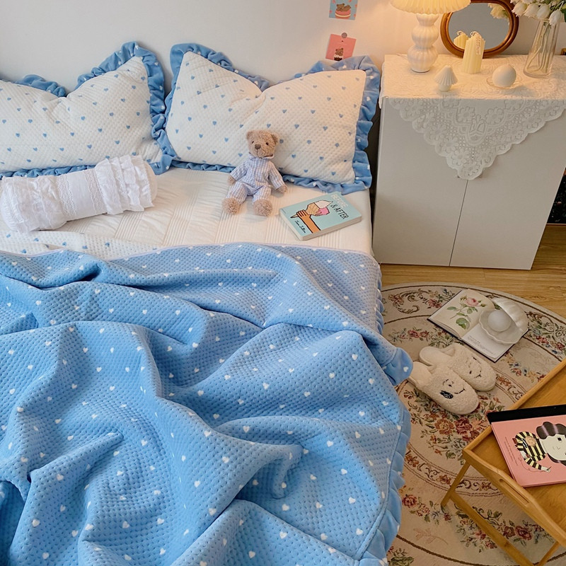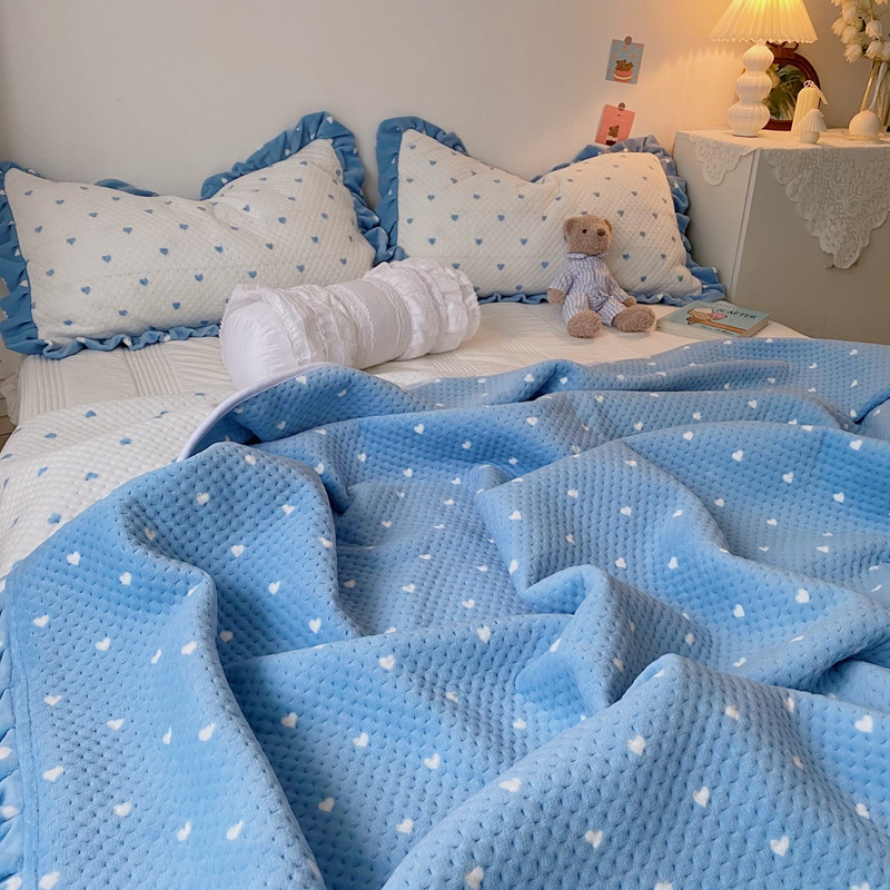 星期八 2020新款奶油色花边牛奶绒床盖 爱心蓝